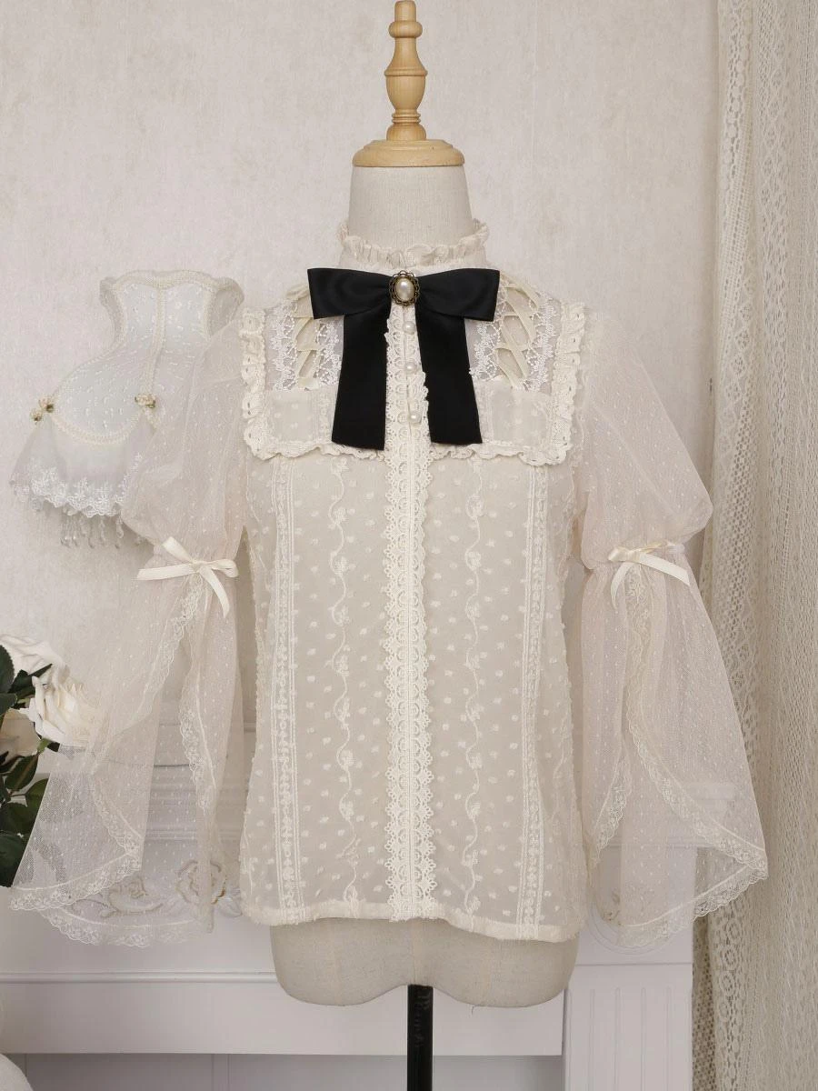 Academic Lolita Outfits Ecru White Lace Long Sleeves Blouse Skirt