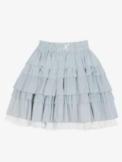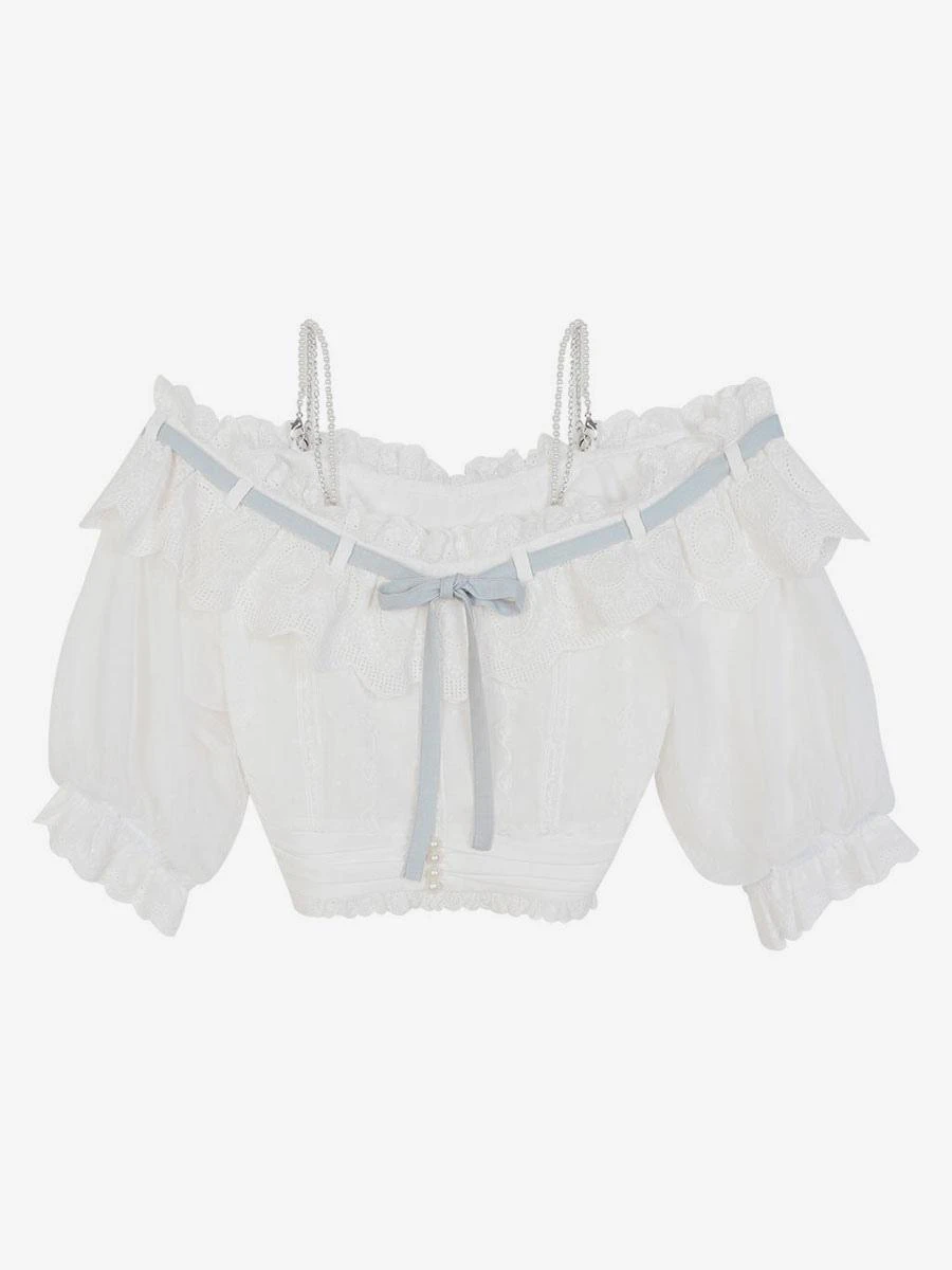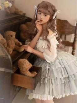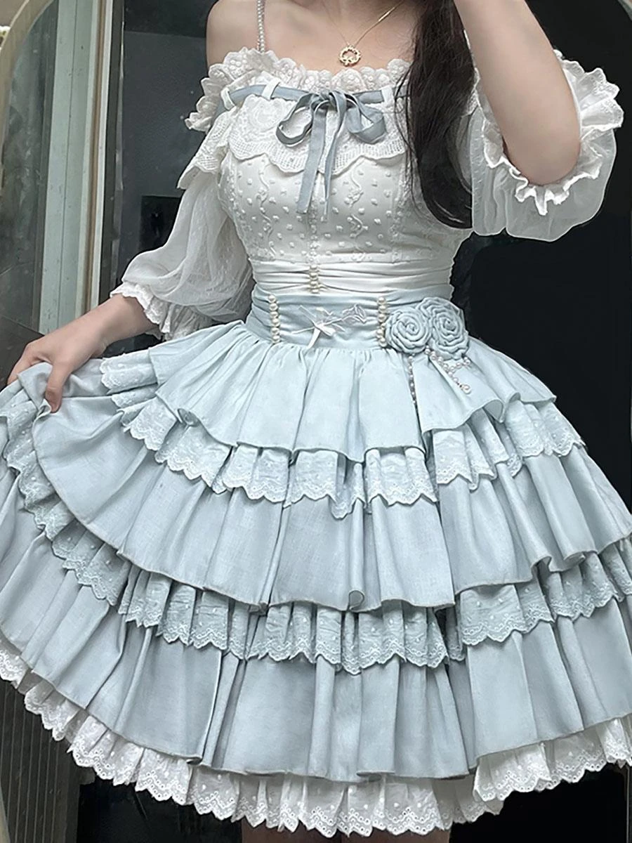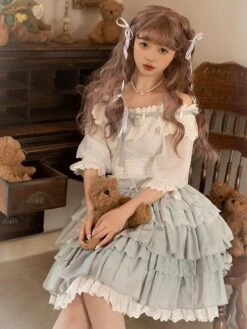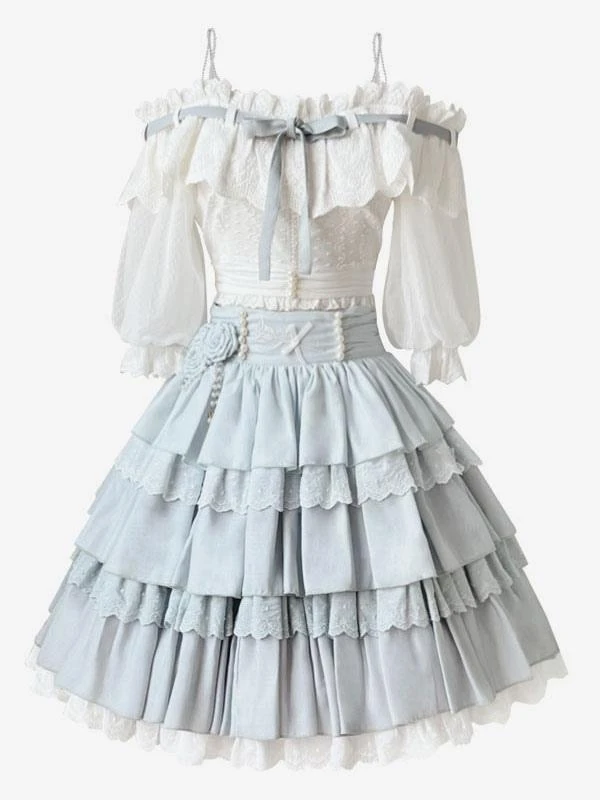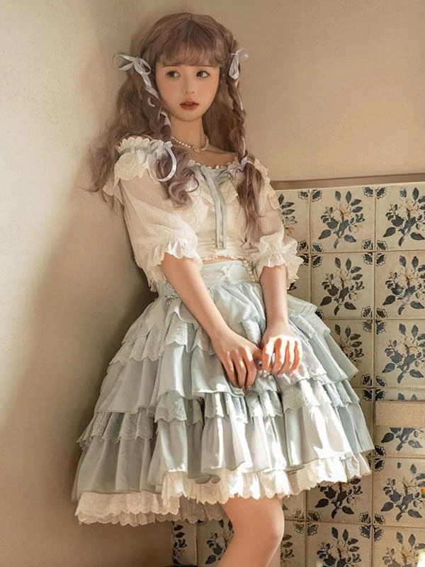 Academic Lolita Outfits Light Sky Blue Ruffles Lace Short Sleeves Top Skirt
