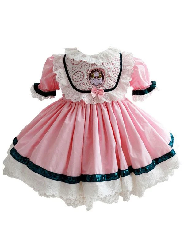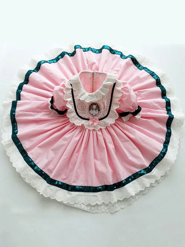 Children’s Sweet Lolita Dress Pink Ruffles Polyester Short Sleeve Kids Princess One Piece Dress