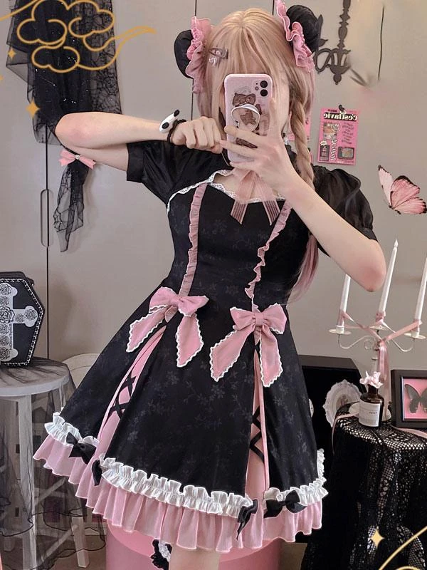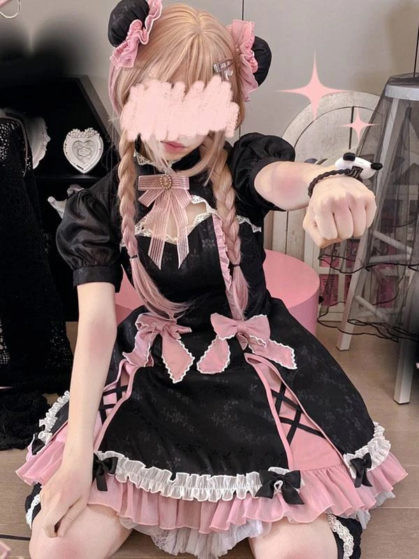 Chinese Style Lolita Dress Bows Short Sleeves Polyester Chinese Style Black Chinese Style Lolita