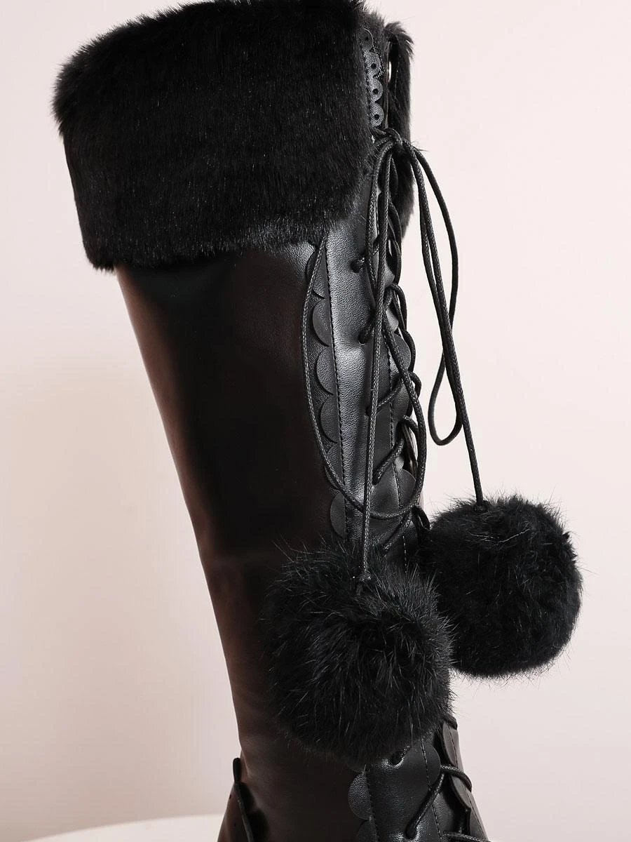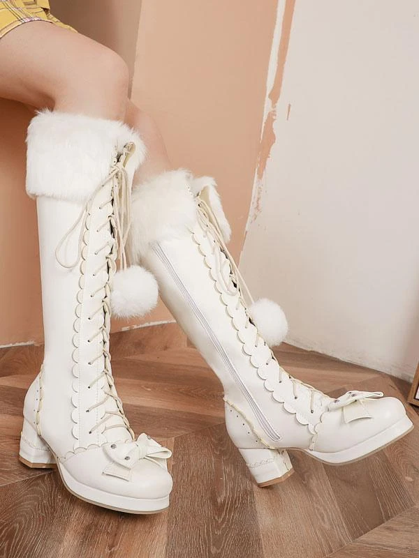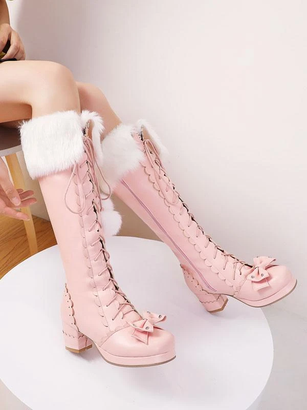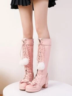 Classic Lolita Boots Knee High Chunky Heel Platform Square Toe Lace Up Pink Lolita Winter Boots