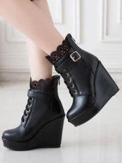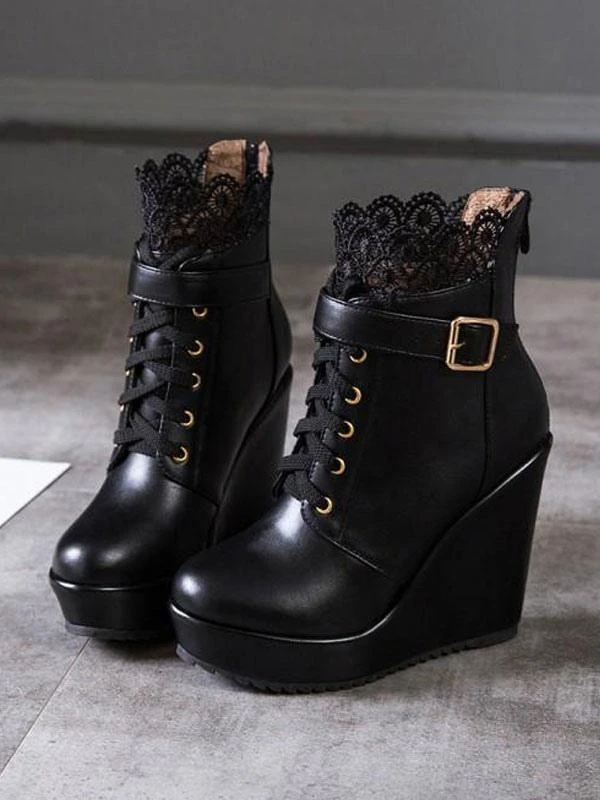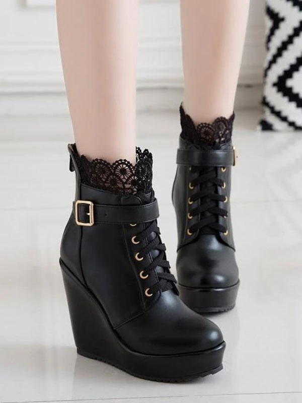 Classic Lolita Boots Lace Buckle Wedge Heel Black Lolita Shoes