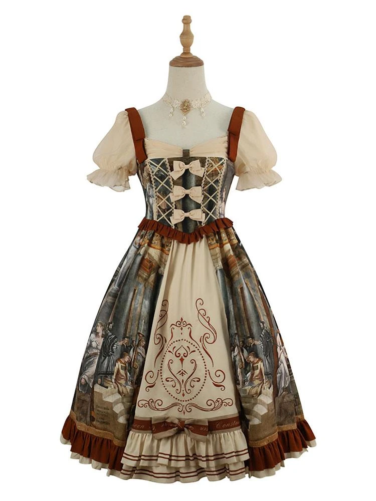 Classic Lolita Dress Bows Printing Short Sleeves Coffee Brown Lolita JSK Dress