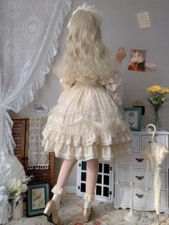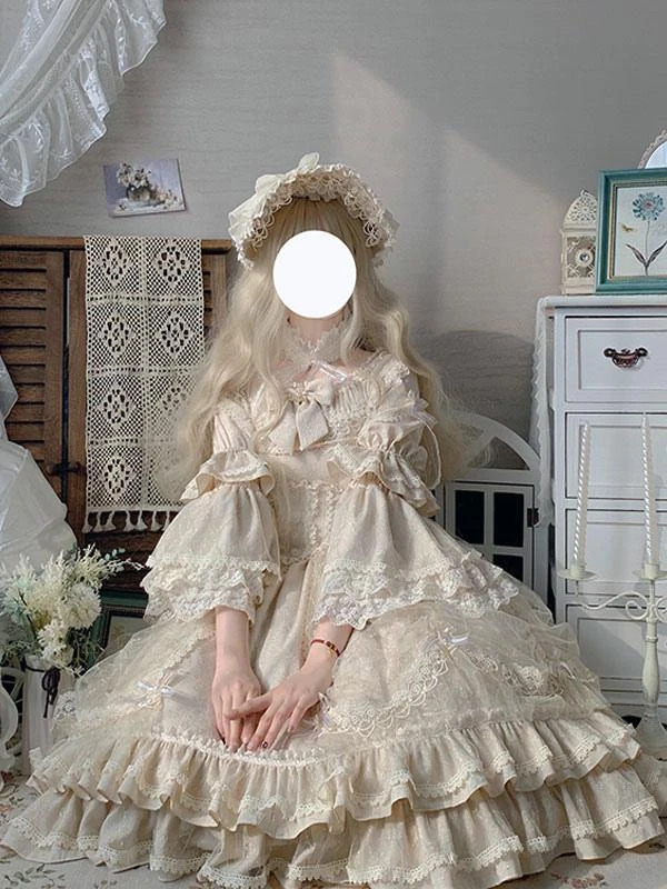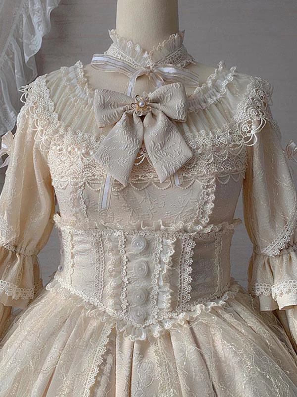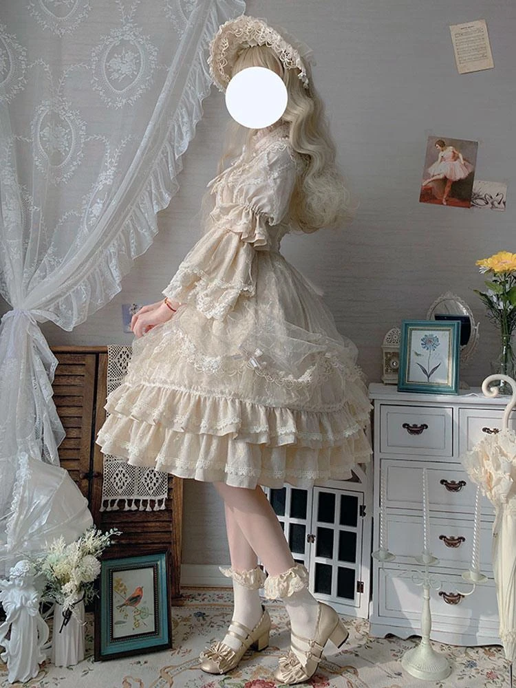 Classic Lolita OP Dress Light Apricot 3/4-Length Sleeve Pleated Lace Ruffles Tea Party Lolita One Piece Dress