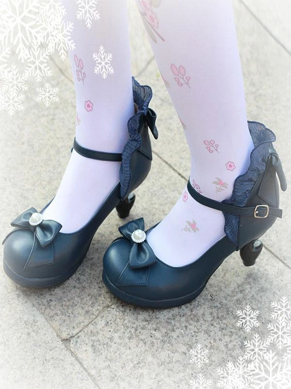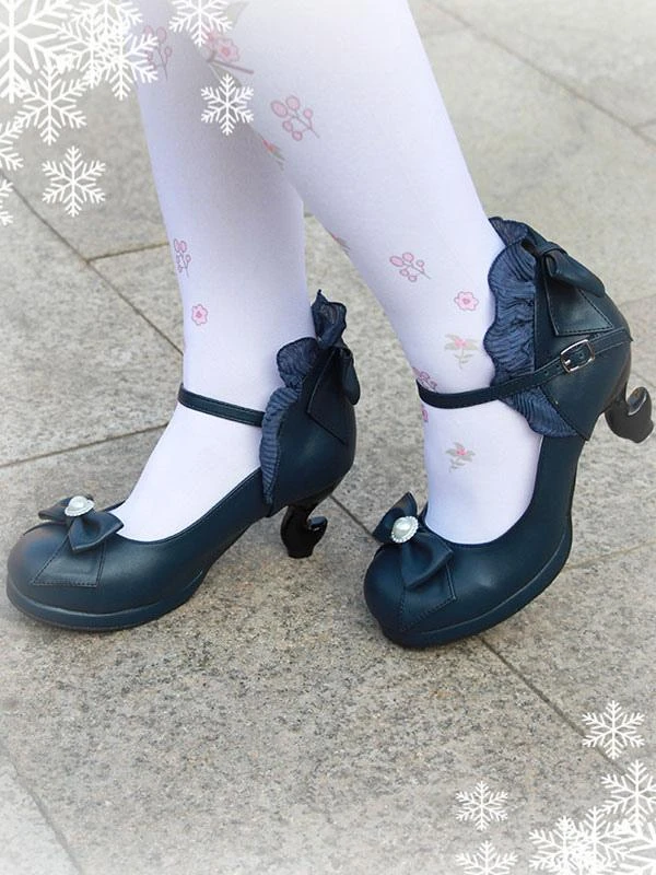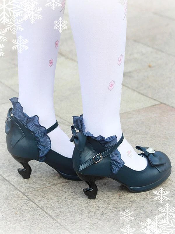 Classic Lolita Pumps Bow Strappy Ruffle PU Deep Blue Lolita Footwear