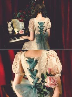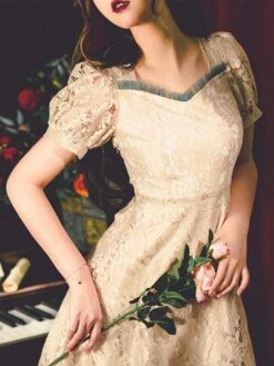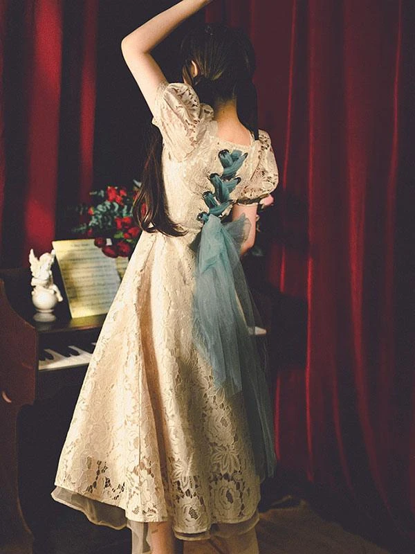 Classic Lolita Retro Dress Lace Up Bows Short Sleeve Light Apricot Lolita OP Dress