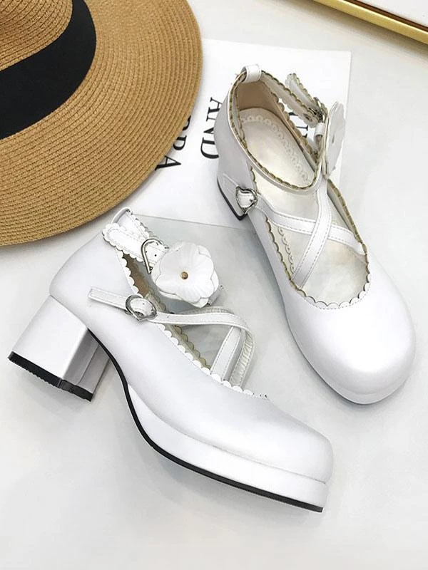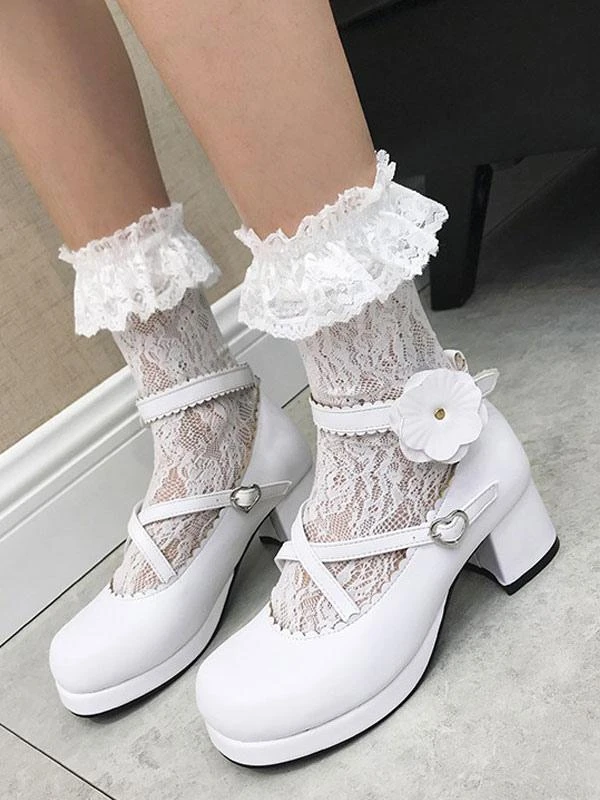 Classic Lolita Shoes Strappy Flower Platform White Chunky Heel Lolita Footwear