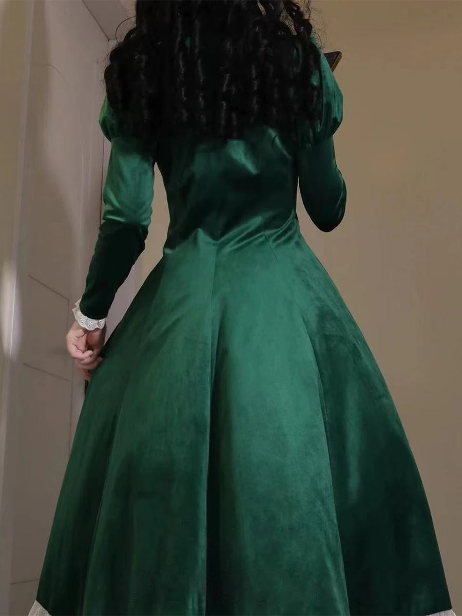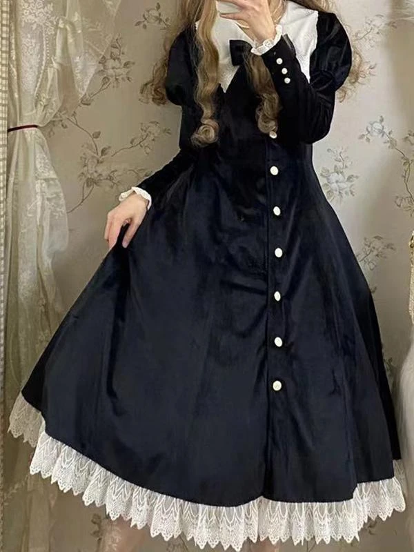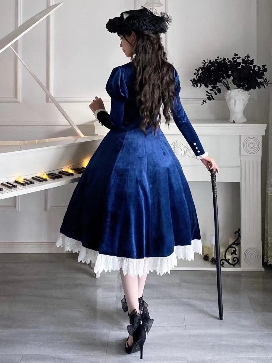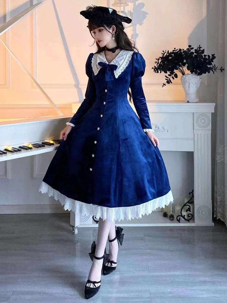 Classical Lolita Dress Velour Short Sleeves Color Block Lolita Dresses Classic Deep Blue