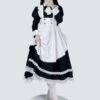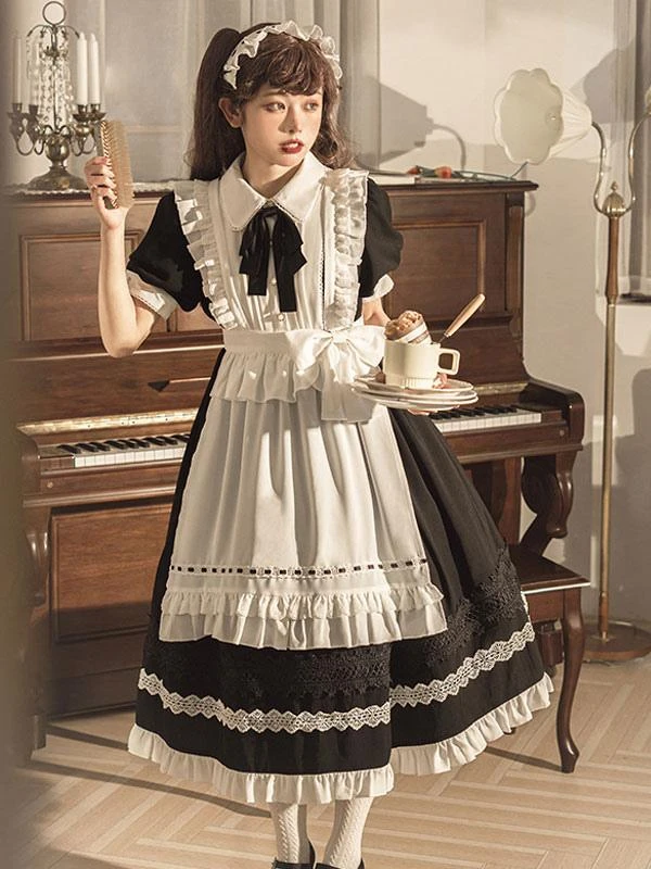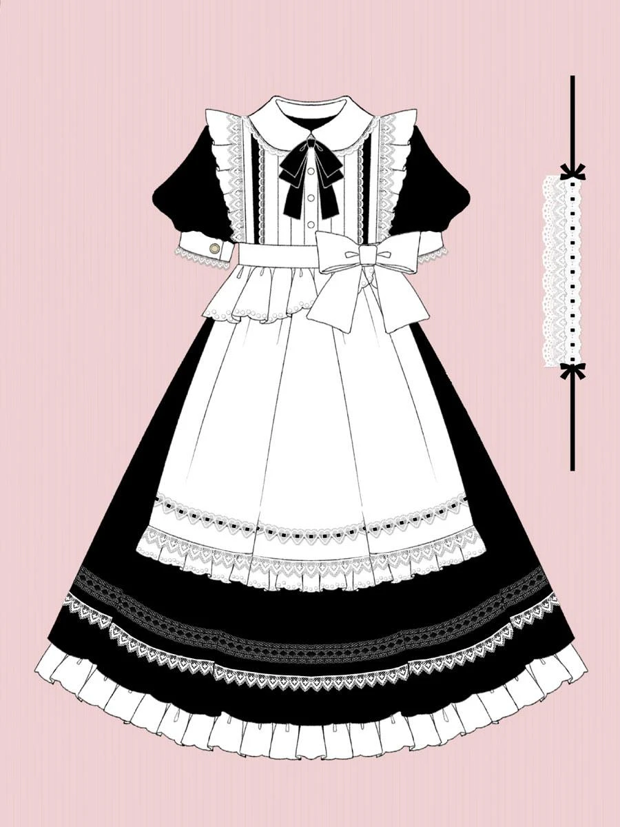 Classical Lolita OP Dress 2-Piece Set Black Dress White Apron Ruffles Bows Color Block Bow Maid Dress