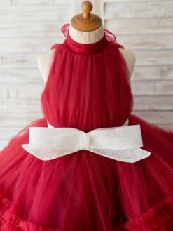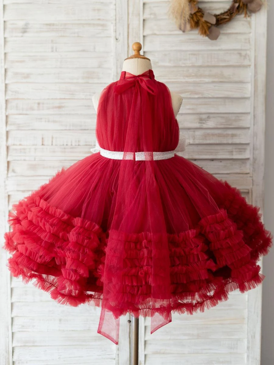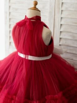 Flower Girl Dresses With Sash High Collar Tulle Sleeveless Knee Length Princess Silhouette Bows Trun Red Kids Party Dresses