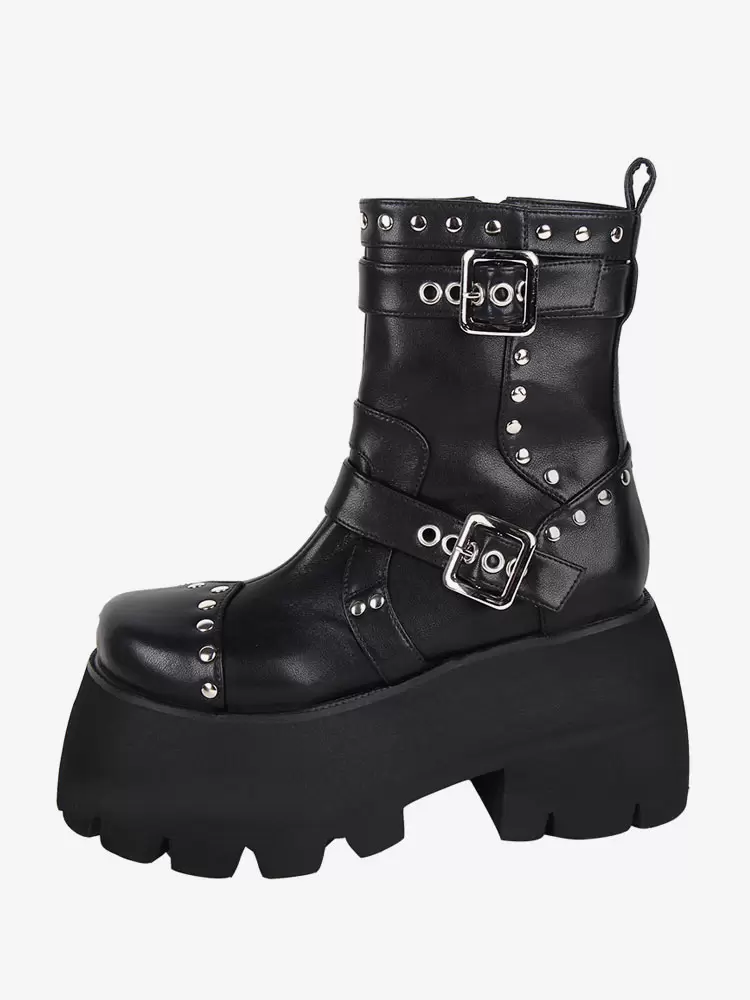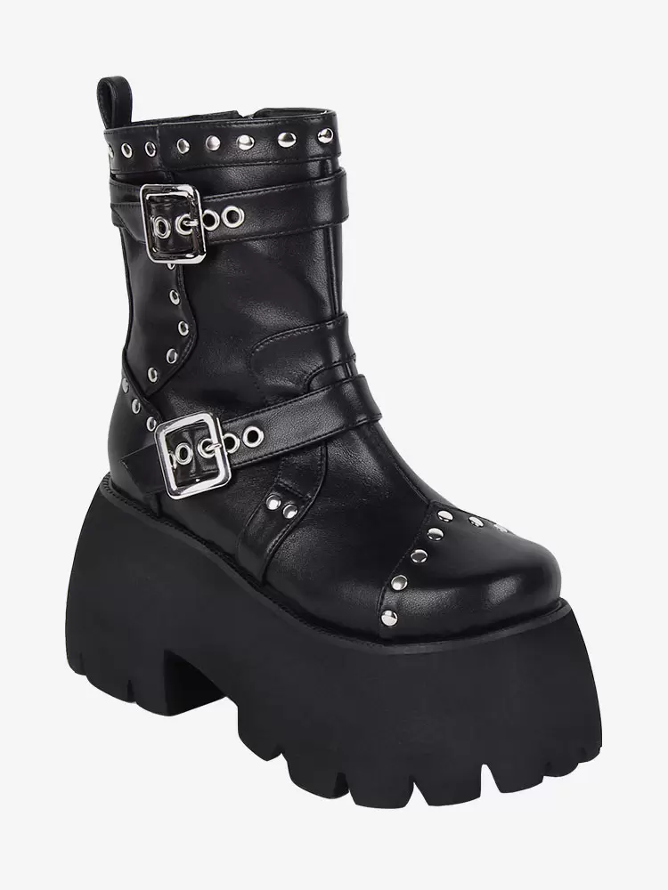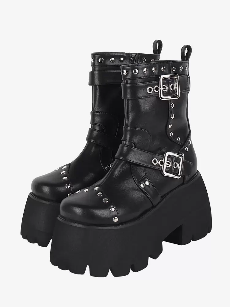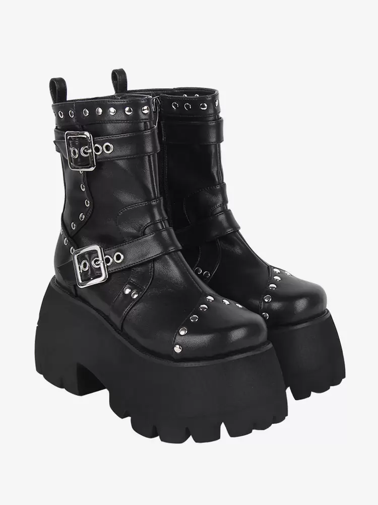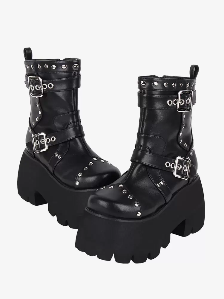 Gothic Lolita Boots Black Grommets Metallic Round Toe PU Leather Lolita Footwear