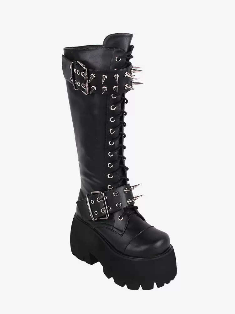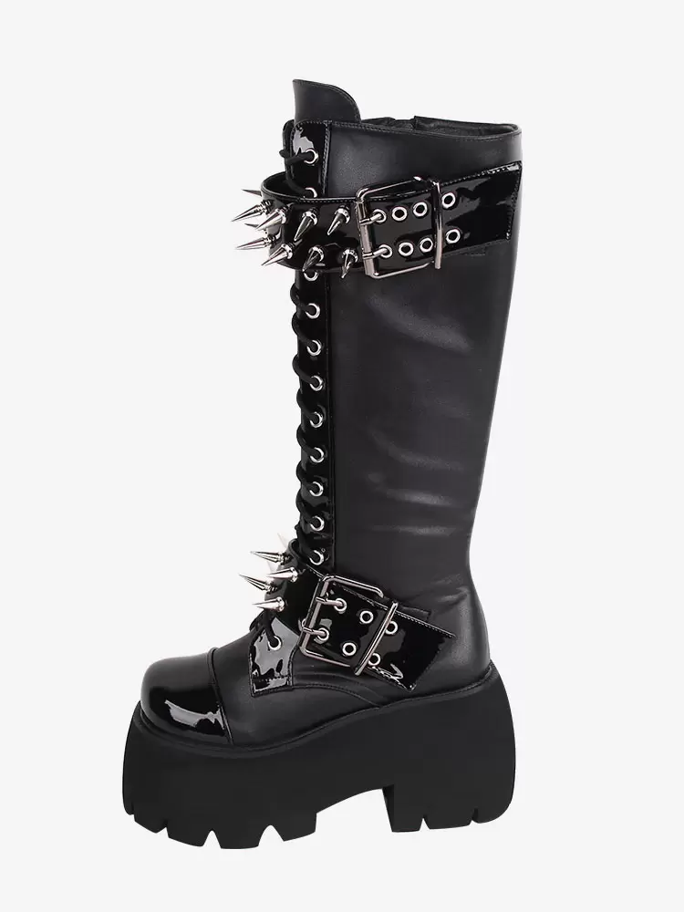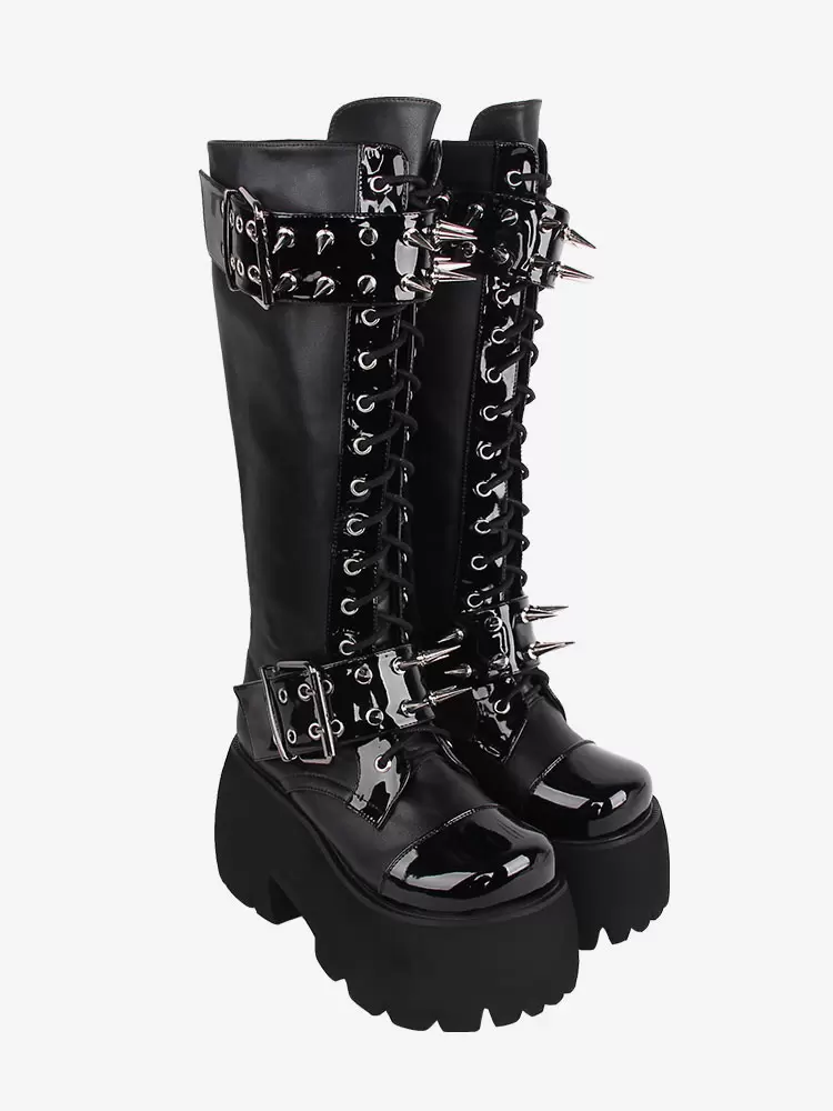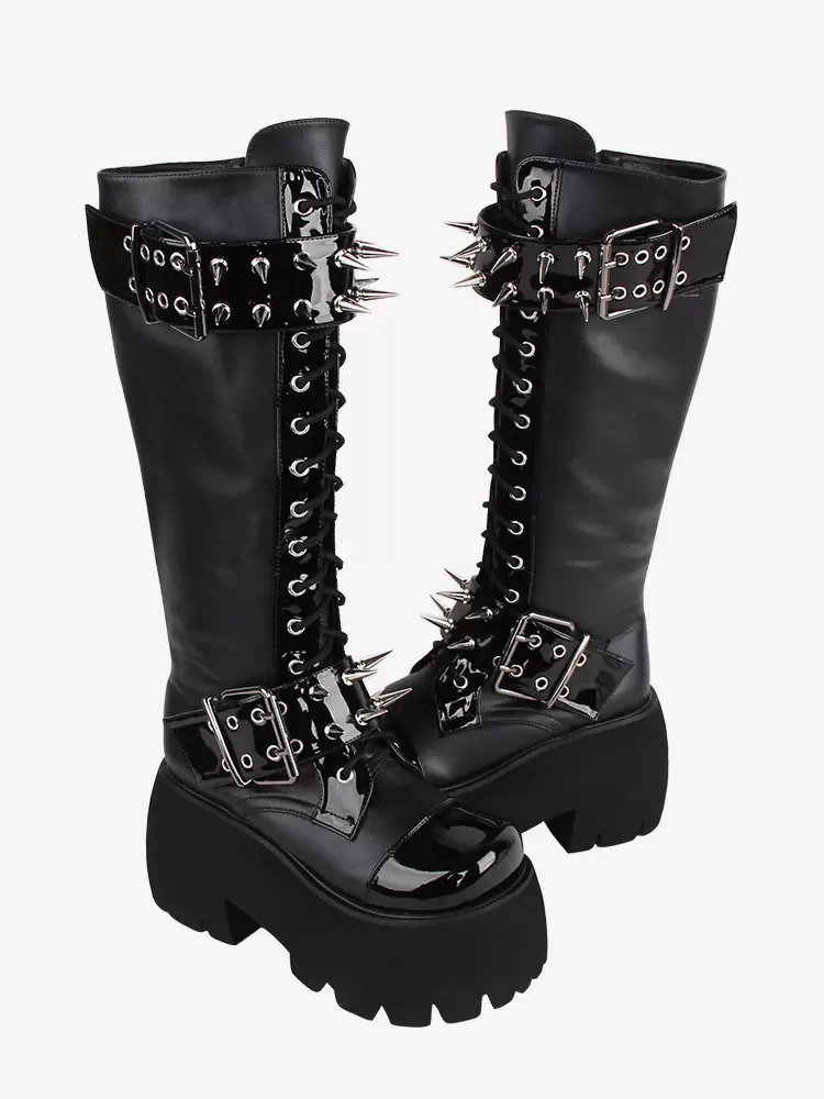 Gothic Lolita Boots Black Grommets Rivets Metallic Round Toe PU Leather Lolita Footwear