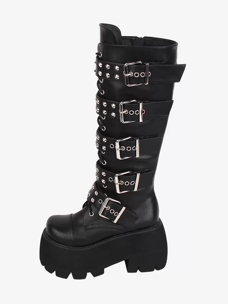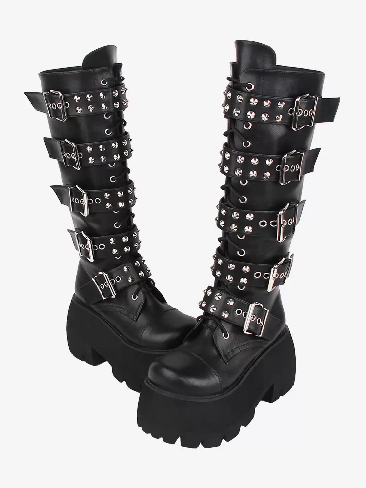 Gothic Lolita Boots PU Leather Glitter Metallic Rivets Grommets Round Toe Black Lolita Footwear