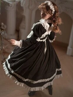 Gothic Lolita Dress Ruffles Bows Long Sleeves Polyester Maid Dress Black Lolita Dress Apron 2-Piece Set