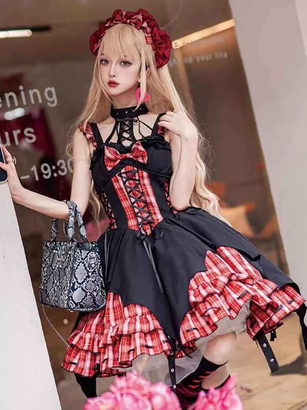Gothic Lolita Dresses Grommets Lace Up Plaid Black Red