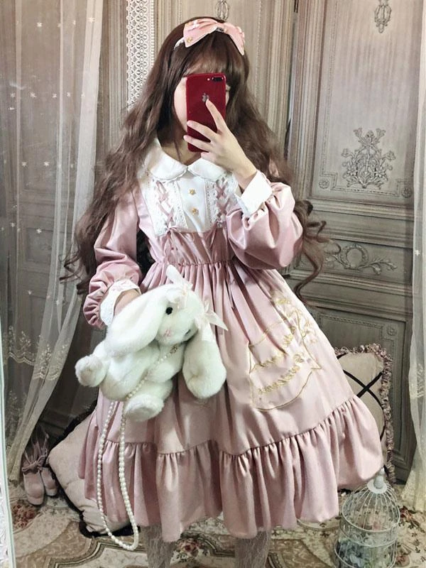 Gothic Lolita OP Dress Buttons Ruffles Stars Print Long Sleeves Lolita One Piece Dresses