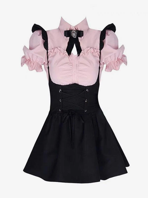Gothic Lolita Outfits Black Lace Up Ruffles Short Sleeves Blouse Jumper
