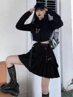 Gothic Lolita Outfits Black Metallic Grommets Chains Long Sleeves Shirt Long Skirt 2-Piece Set