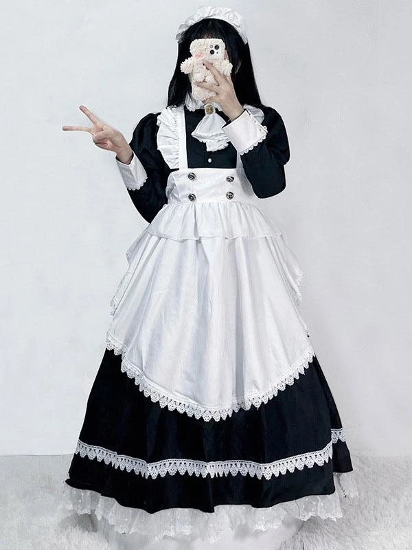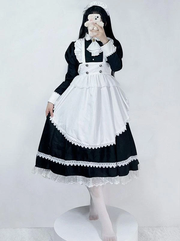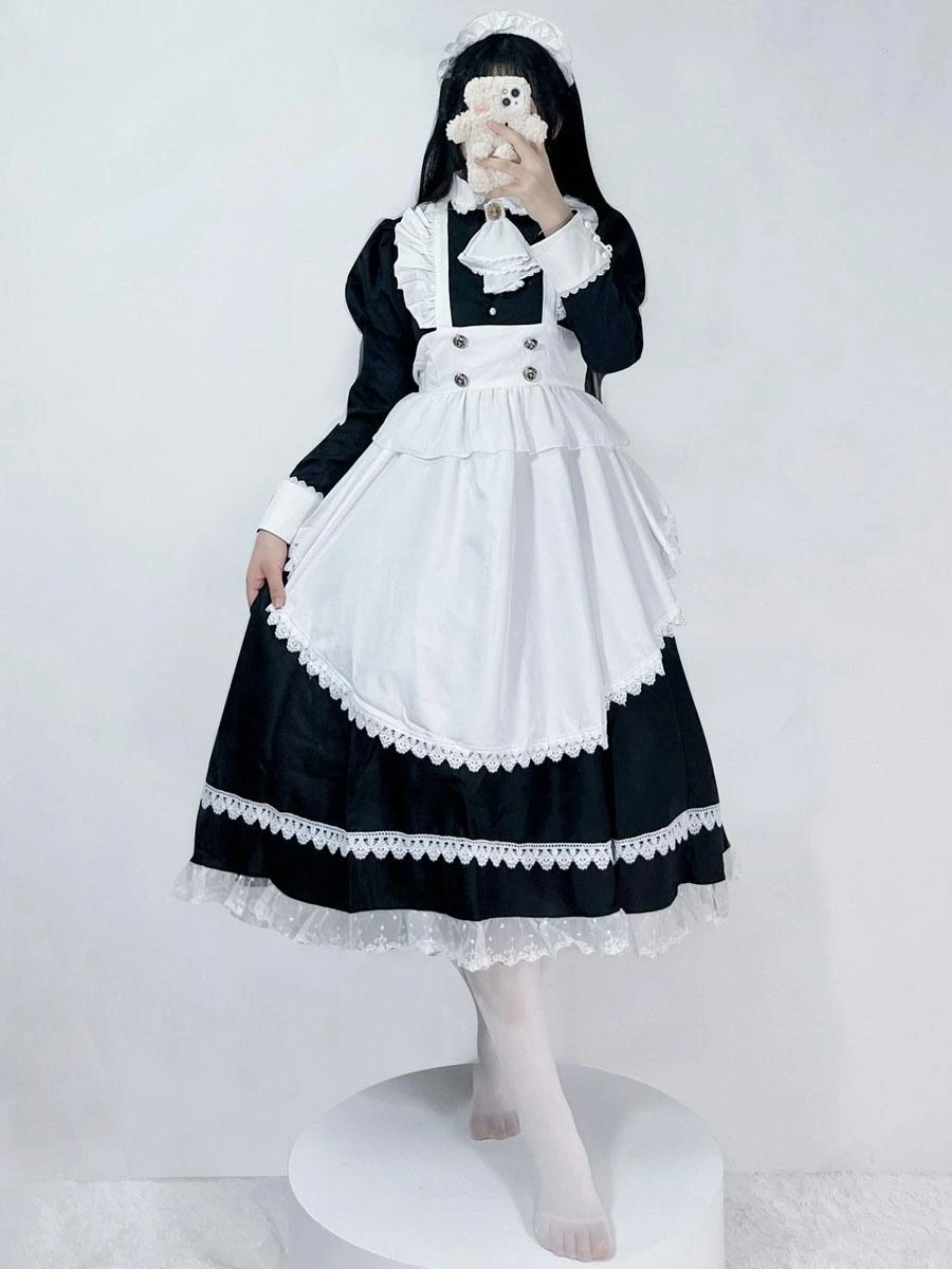Gothic Maid Lolita Dresses Lace Ruffles Long Sleeves Black Lolita Dress