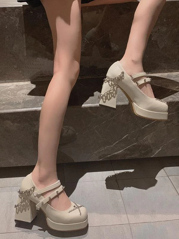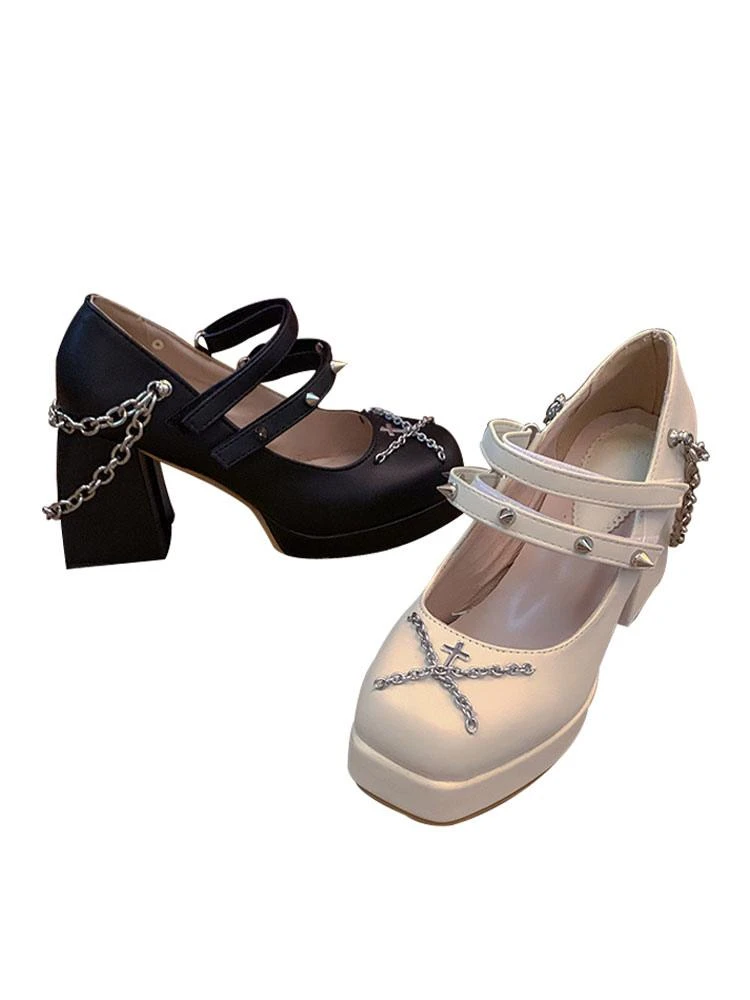 Gothic Shoes Y2K Two Tone Cross Chain Square Toe Black Chunky Heel Lolita Shoes