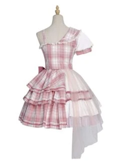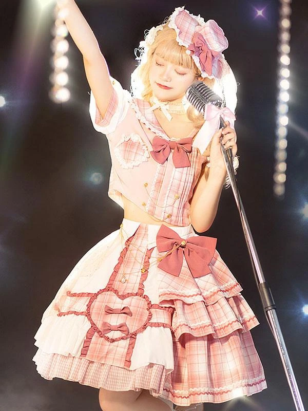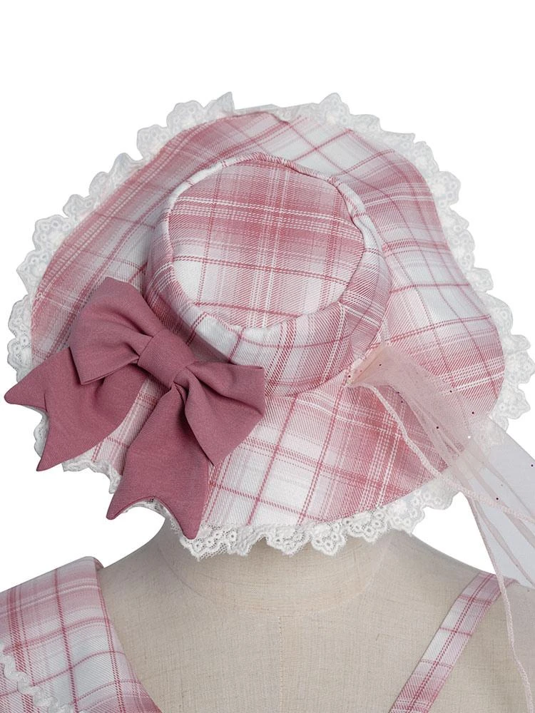 Idol clothes Lolita OP Dress 4-Piece Set Sleeveless Plaid Pattern Bows Metal Details Polyester Pink Lolita One Piece Outfit
