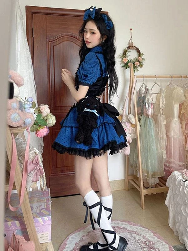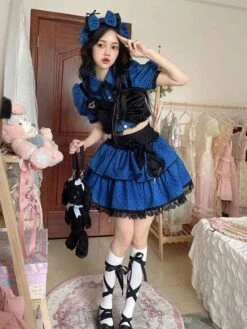 Idol clothes Lolita Outfits Blue Ruffles Polka Dot Short Sleeves Top Skirt Adjustable Elastic