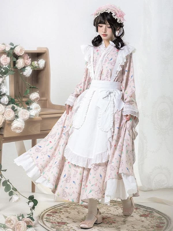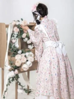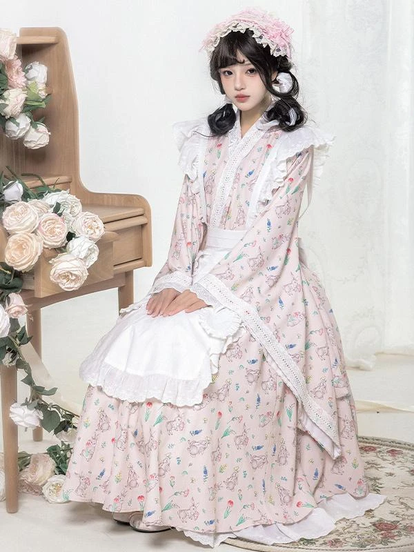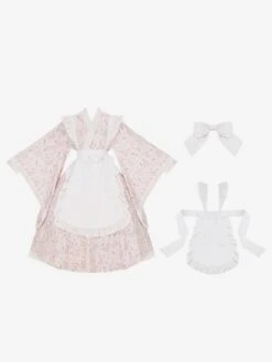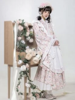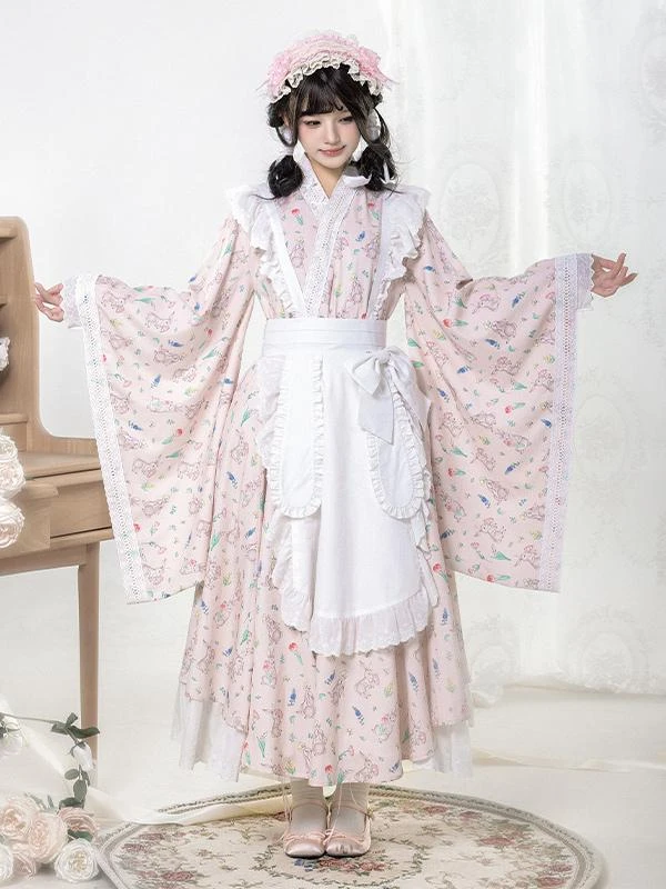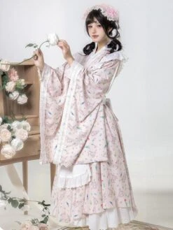 Japanese Style Lolita Costumes Lolita Dresses Polyester Ruffles Floral Print Kimono Long Sleeves Pink