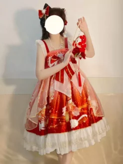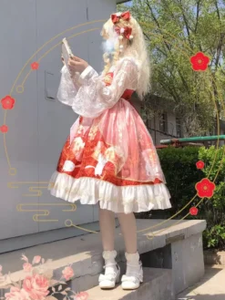 Japanese Style Lolita Costumes Lolita Dresses Polyester Ruffles Floral Print Kimono Sleeveless Red