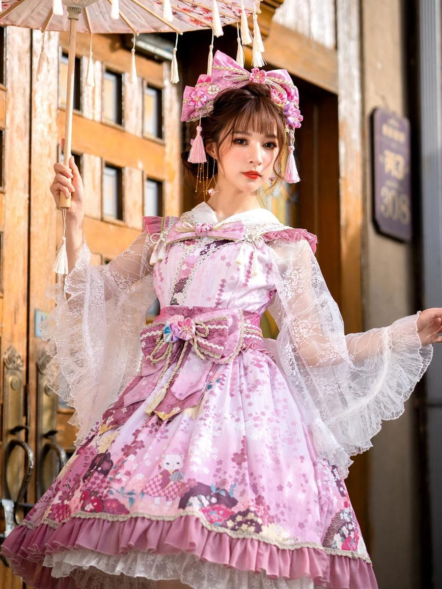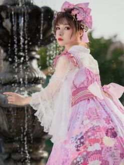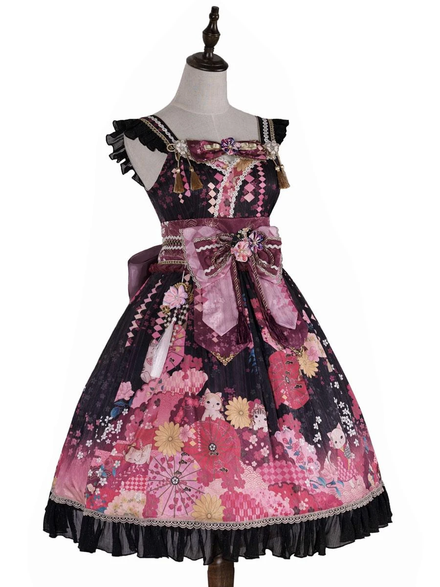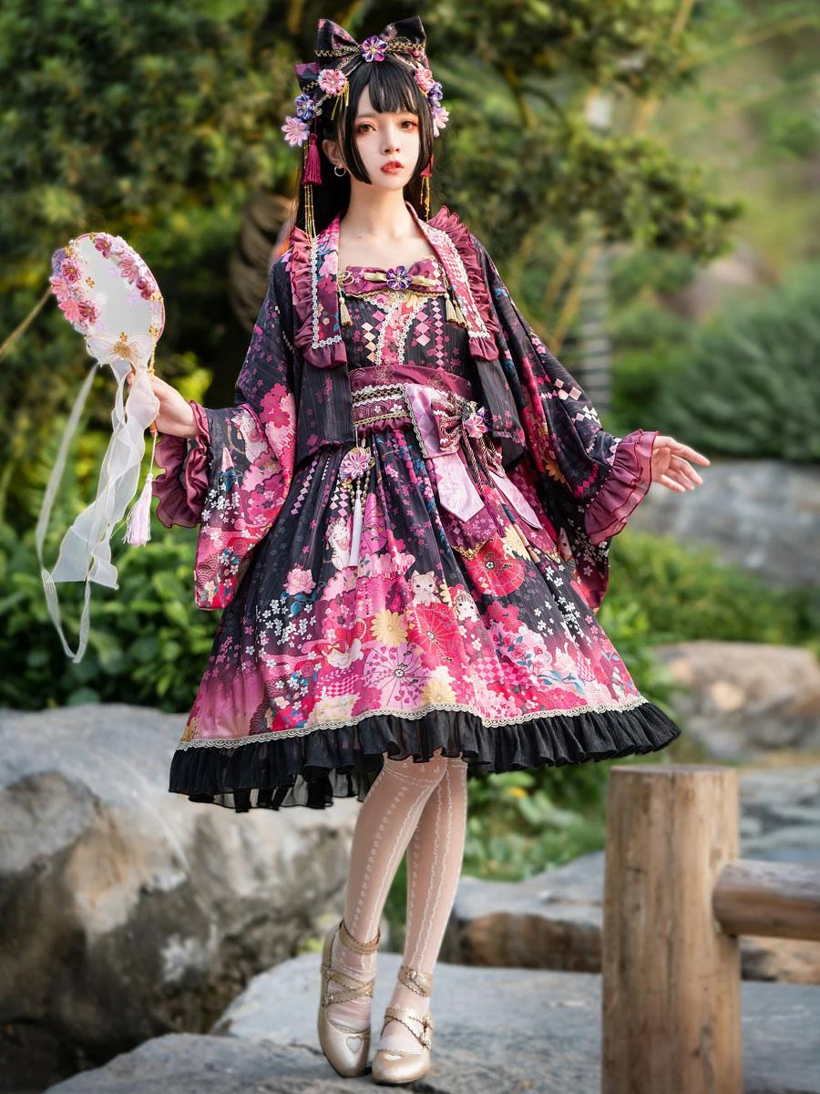 Japanese Style Lolita Dress 3-Piece Set Floral Print Sleeveless Bowknot Kimono Lolita Outfits
