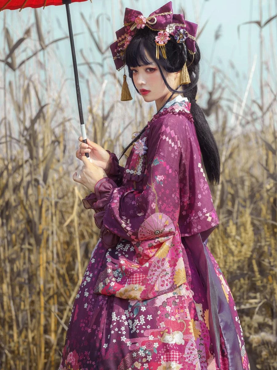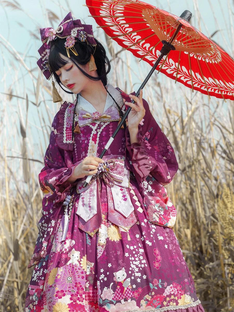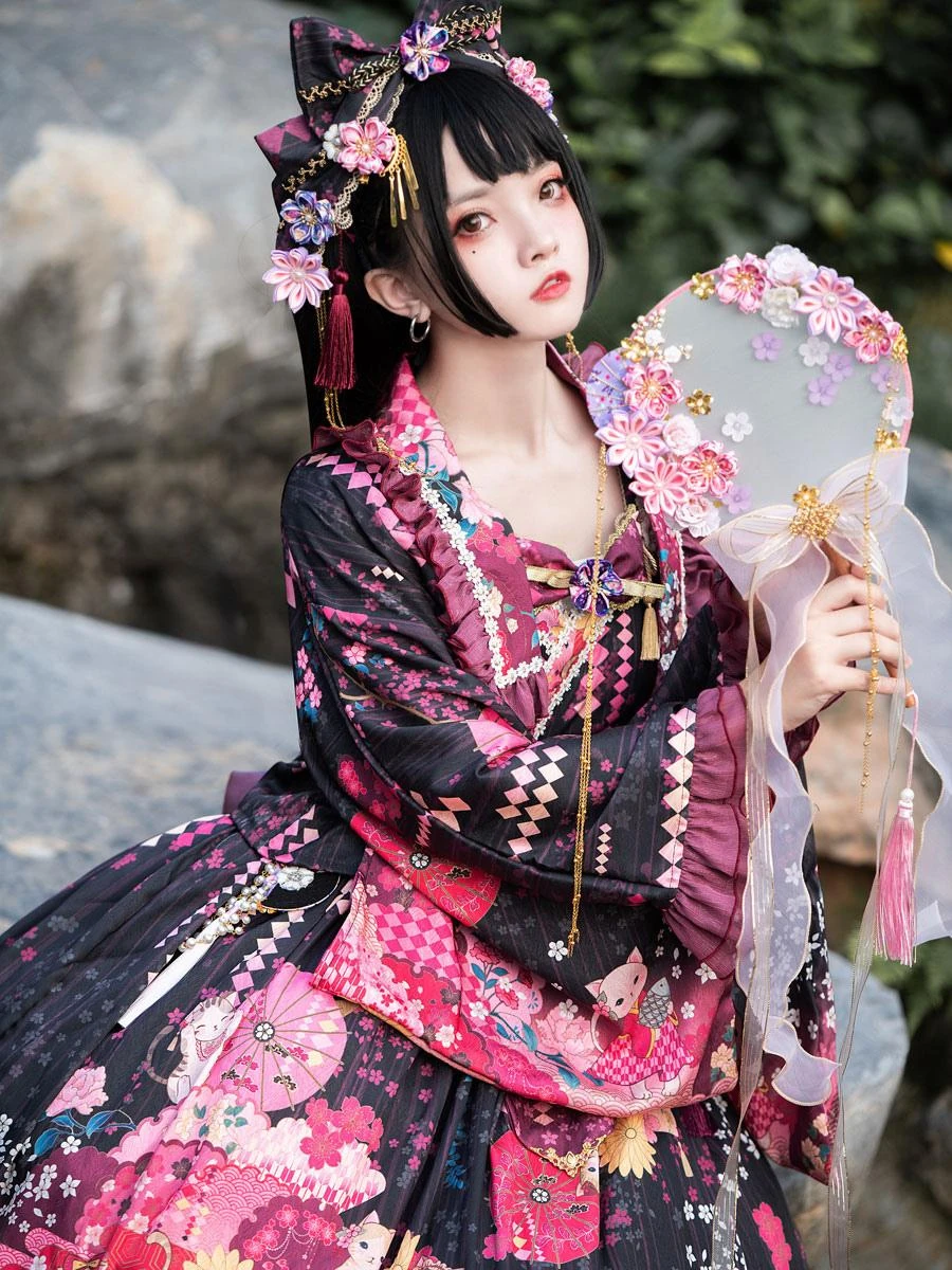 Japanese Style Lolita Dress 3-Piece Set Floral Print Sleeveless Bowknot Kimono Lolita Outfits