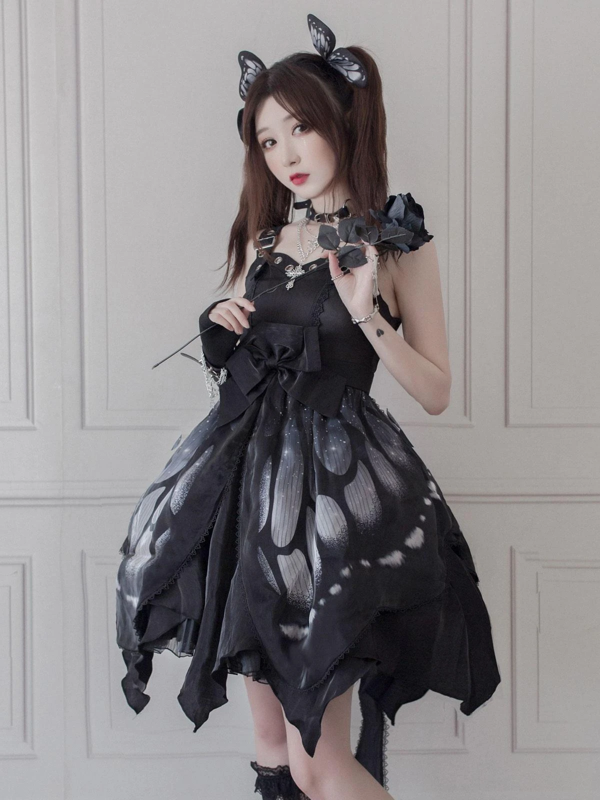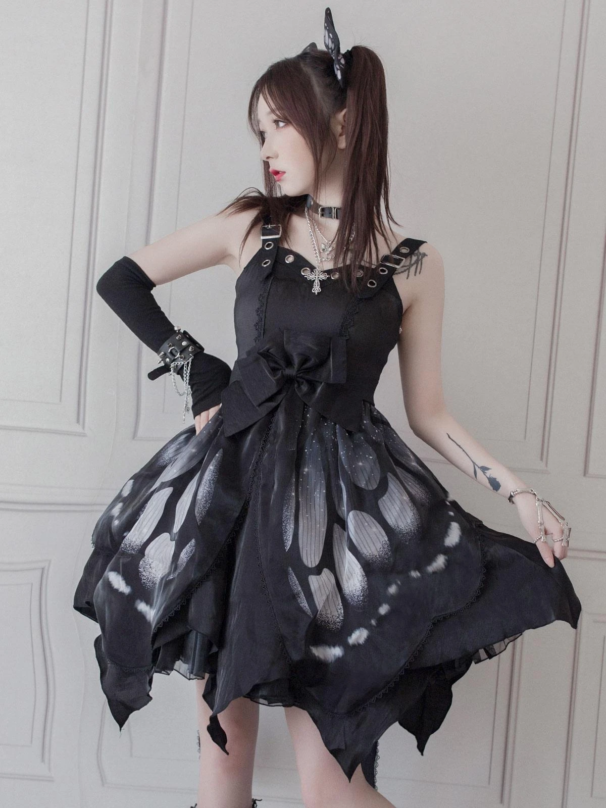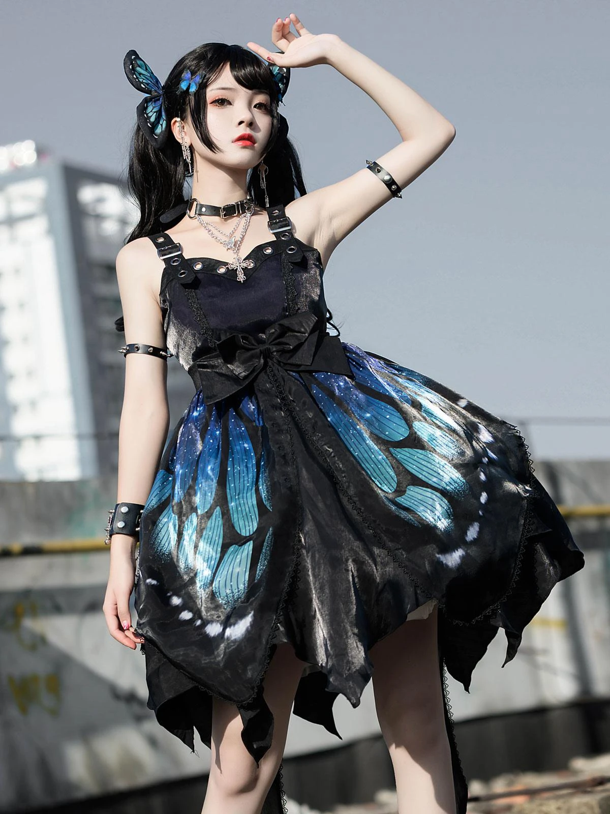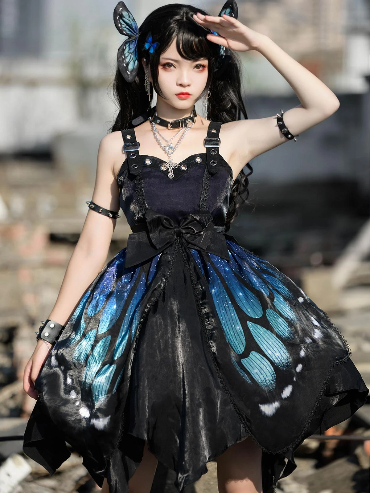 JSK Gothic Lolita JSK Dress Blue Sleeveless Lace Up Ruffles Bow Butterfly Pattern Polyester Casual Lolita Jumper Skirt