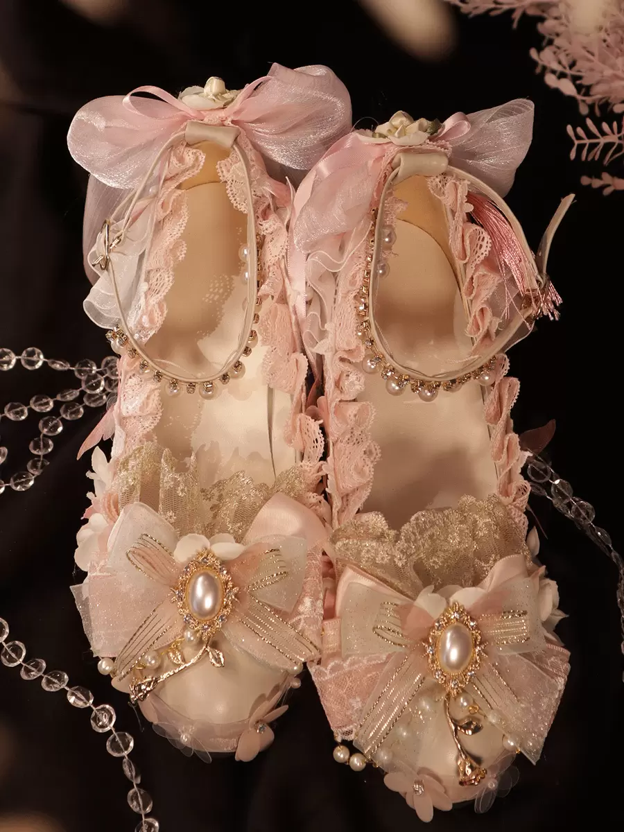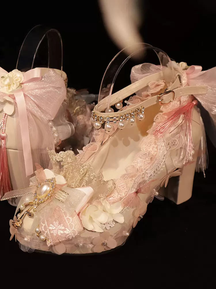 Lolita Wedding Dress Lolita Footwear Pink Pearls Bows Fringe PU Leather Chunky Heel Lolita Pumps