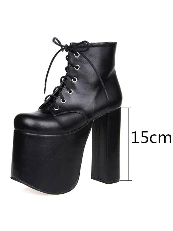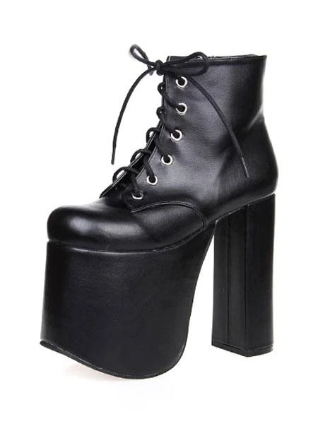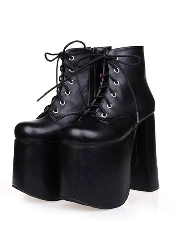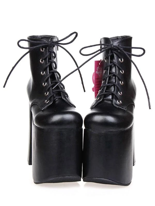 Lolitashow Black Lolita Booties Chunky Heel Platform Round Toe Lace Up Lolita Short Boots