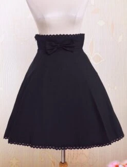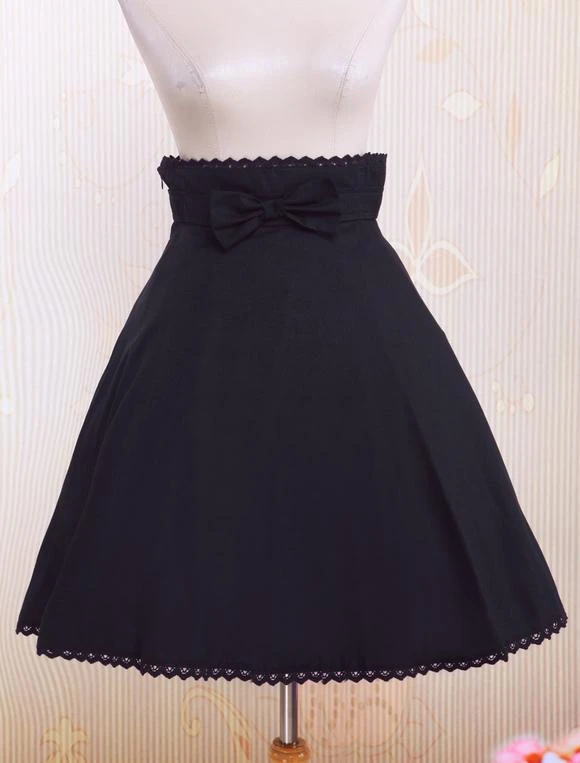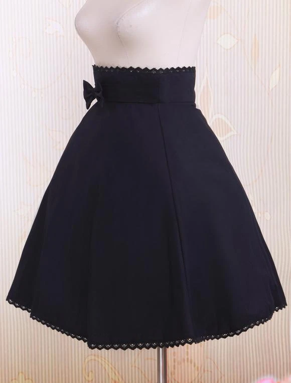 This kind of black lolita skirt features its pleated design with a bow decorated on the waist,and it is made of cotton.The underwear is available.