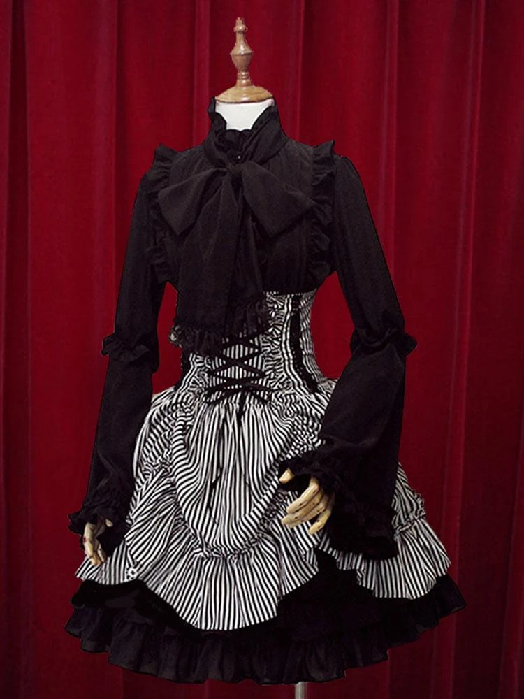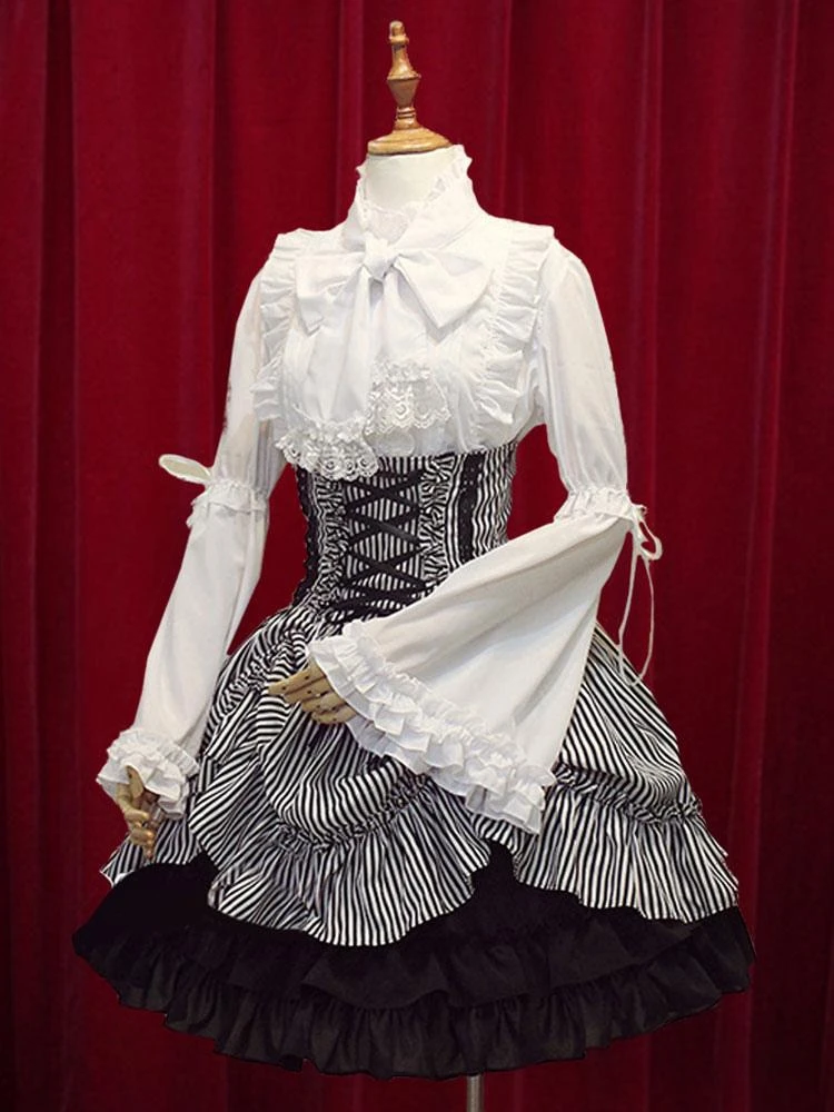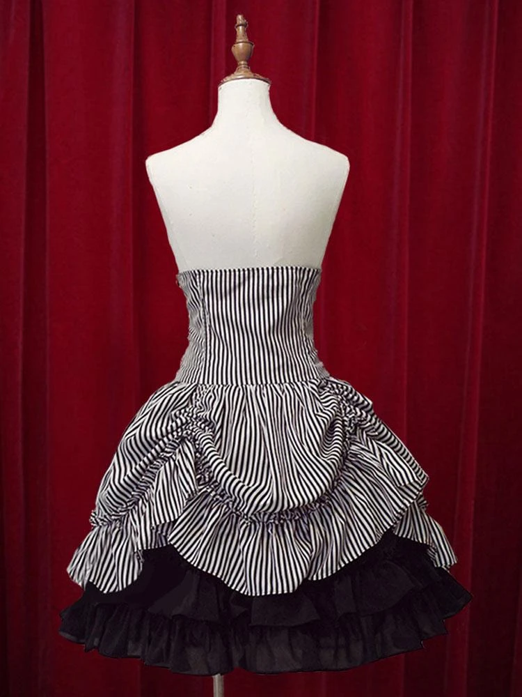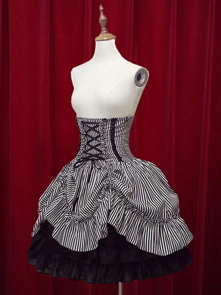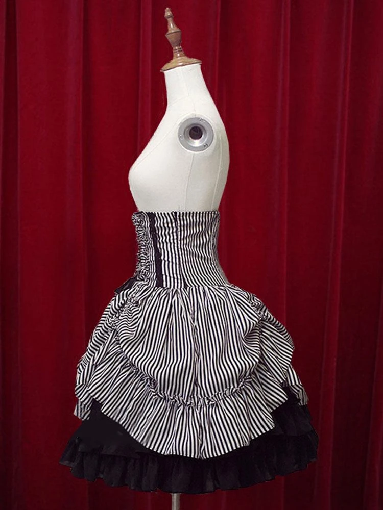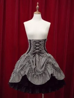 Lolitashow Black White Stripe High Waist Lolita Skirt Cotton Lace Up