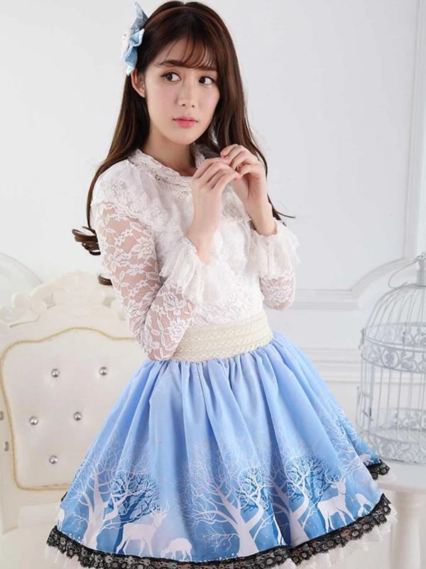 Lolitashow Blue Short Lolita Skirt Lace Trim Polyester Print