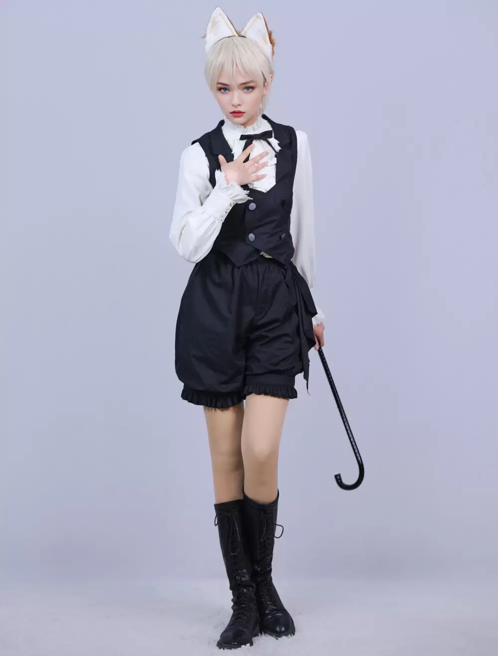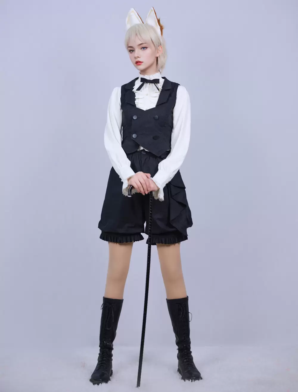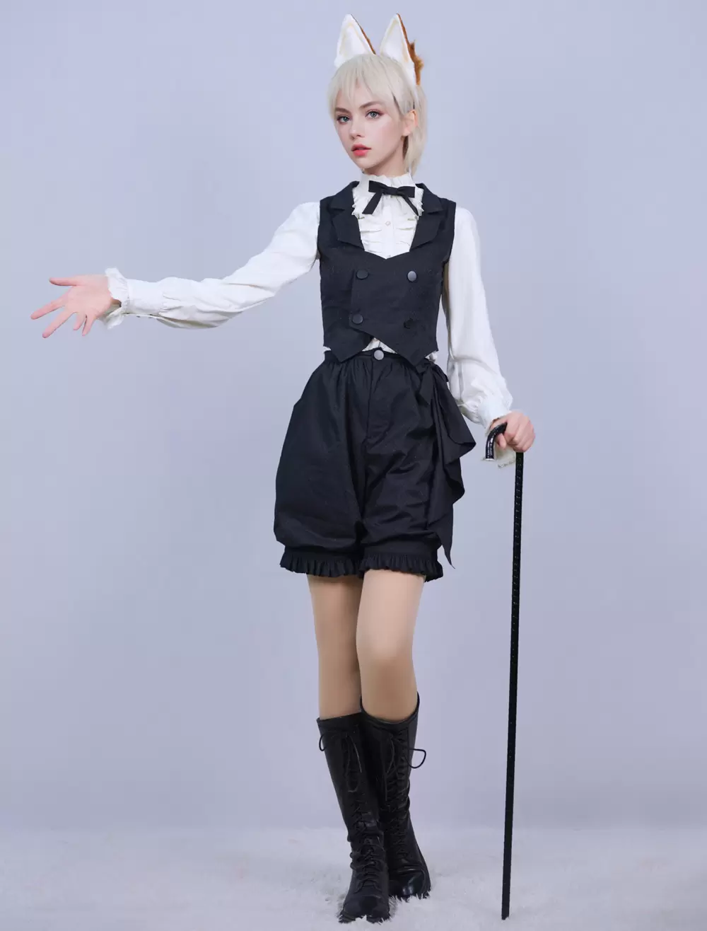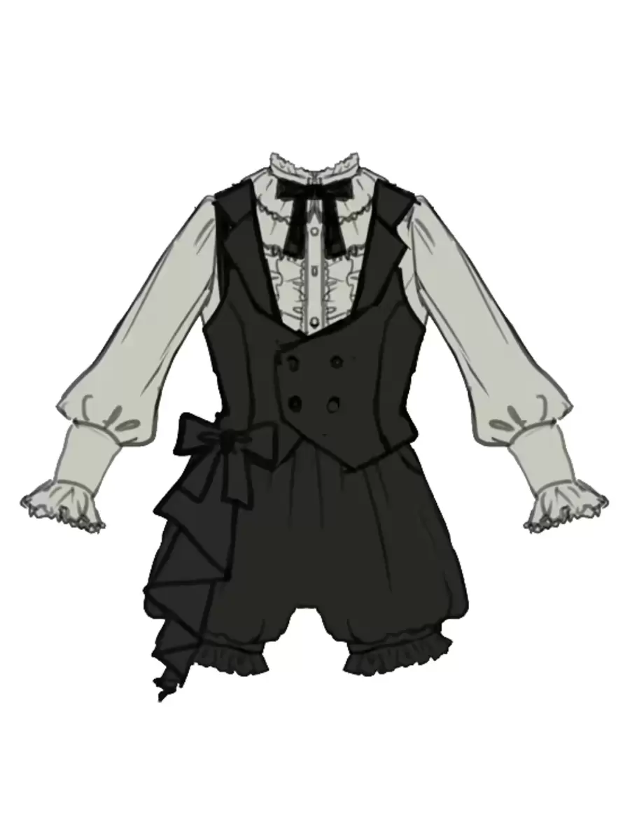 Lolitashow Exclusive Ouji Lolita Three-Piece Outfits Black Bows Ruffles Lace Pants Waistcoat Blouse Set Daily Casual Long Sleeve