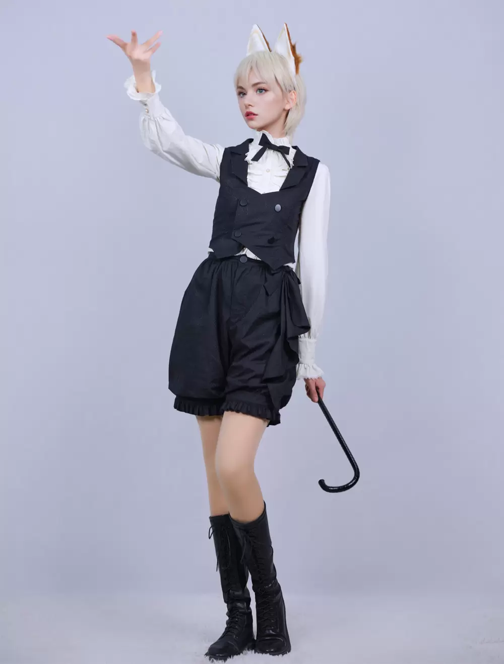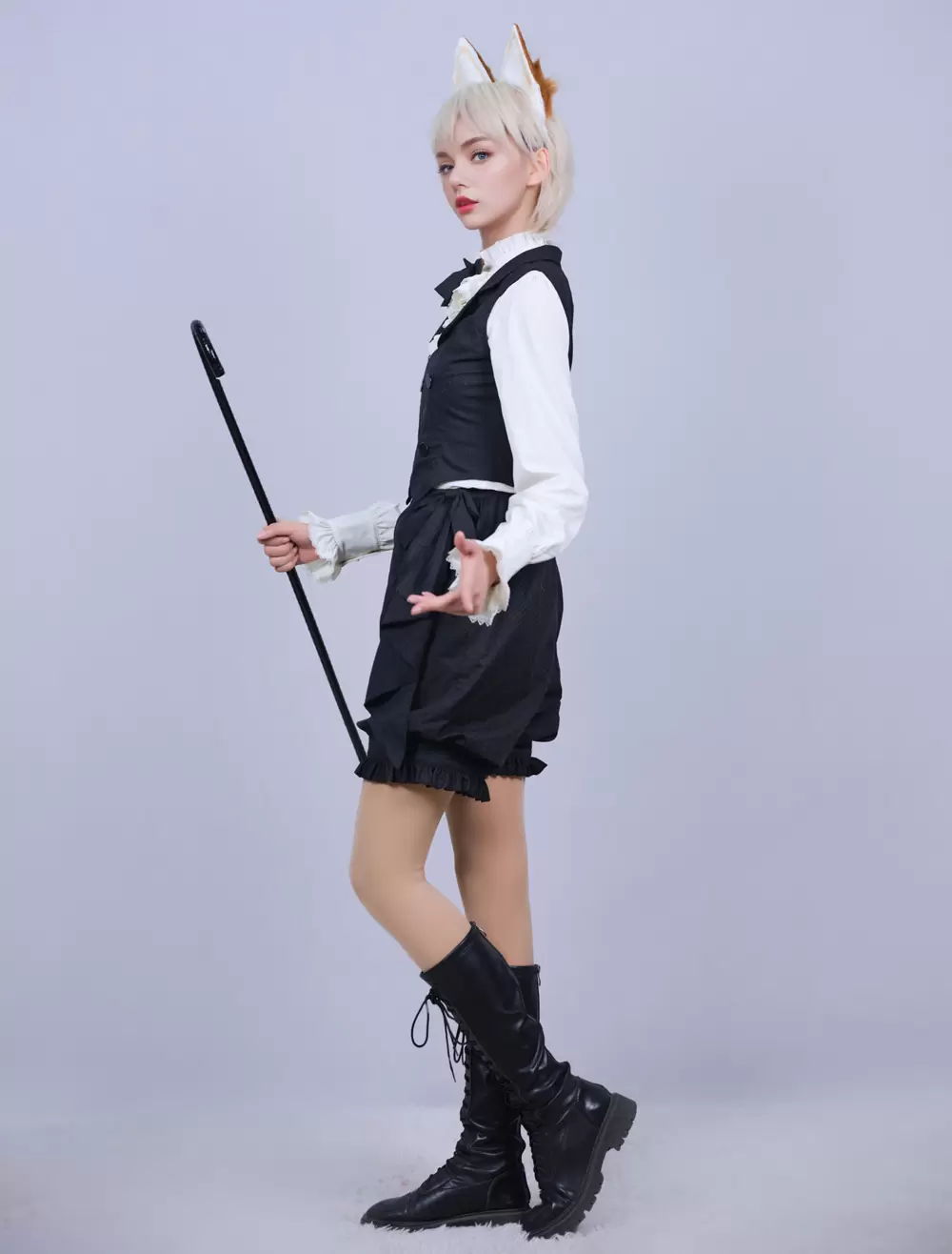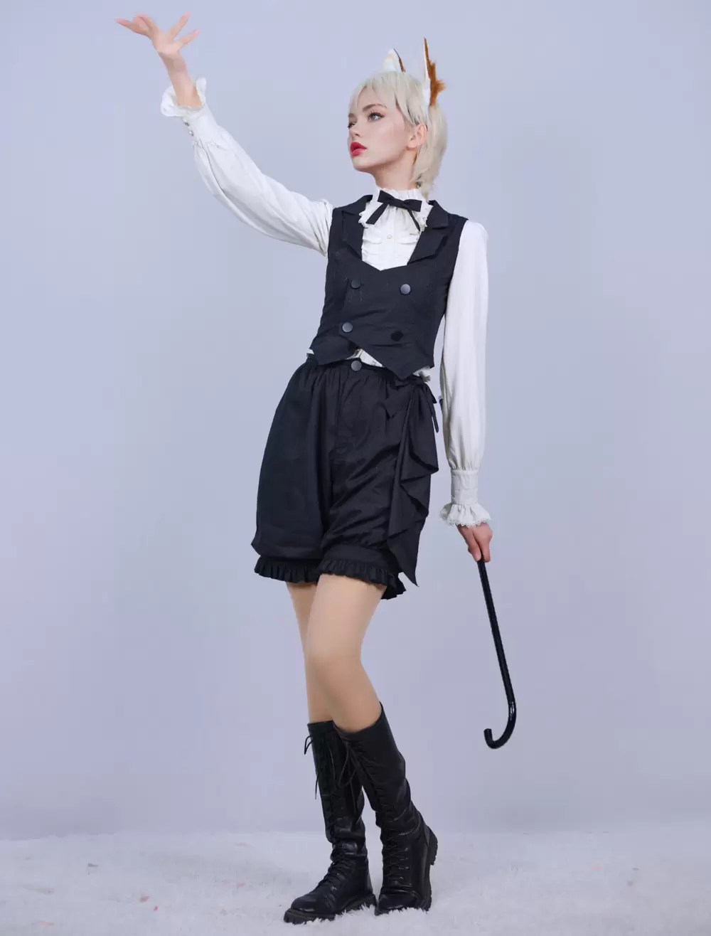 Lolitashow Exclusive Ouji Lolita Three-Piece Outfits Black Bows Ruffles Lace Pants Waistcoat Blouse Set Daily Casual Long Sleeve