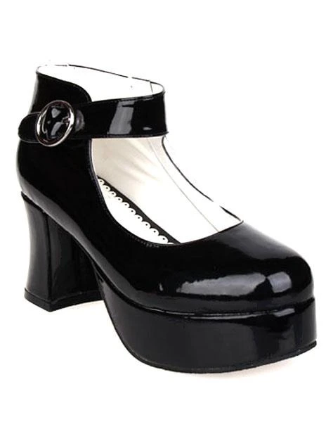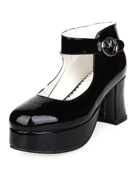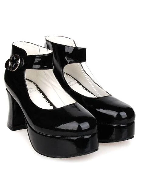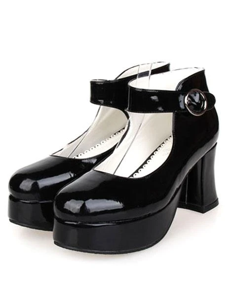 Lolitashow Glossy Black High Chunky Heels Lolita Shoes Platform Ankle Strap Buckle