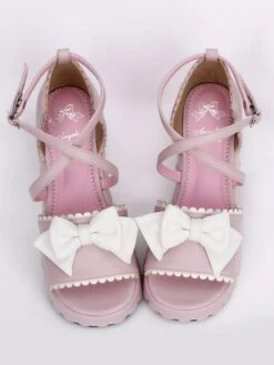 Lolitashow Pink Lolita Platform Sandals White Bows Ankle Straps Heart Shape Buckle