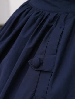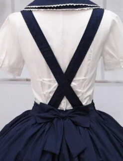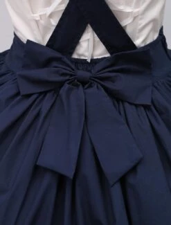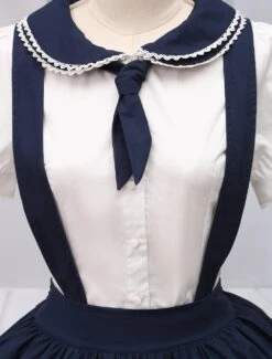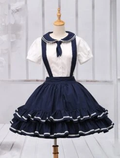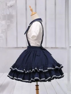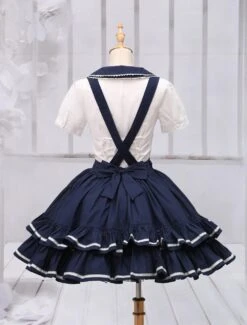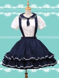Charming navy blue lolita skirt with detachable suspender straps design. Unique two tiers ruffles on hemline with delicate piping design. Back elastic waist makes sure the skirt be suitable for you. There are hidden pockets on side. Match item 456281 to create a sailor feeling.