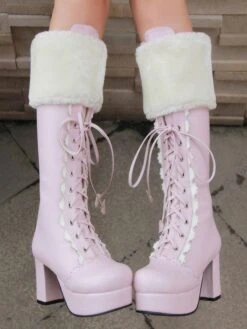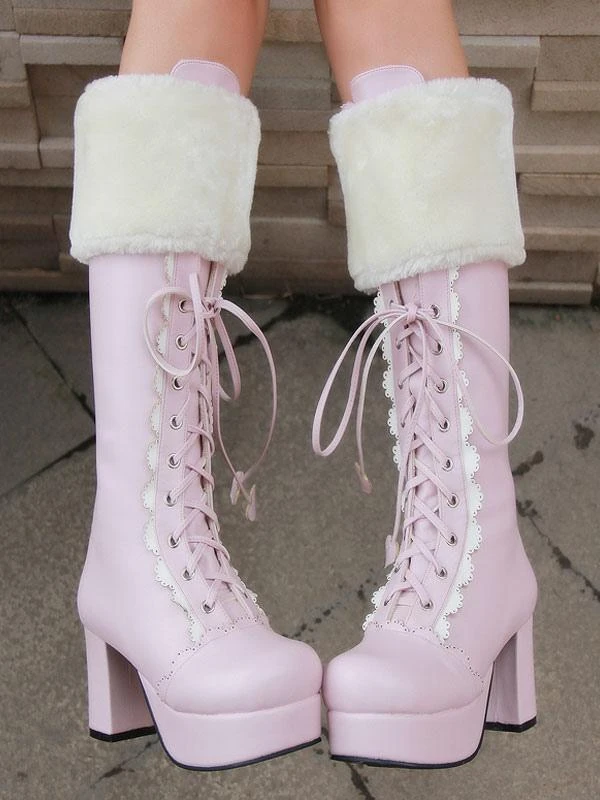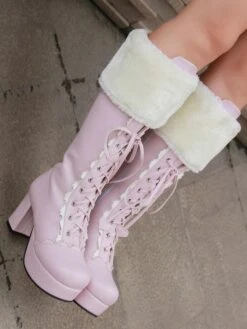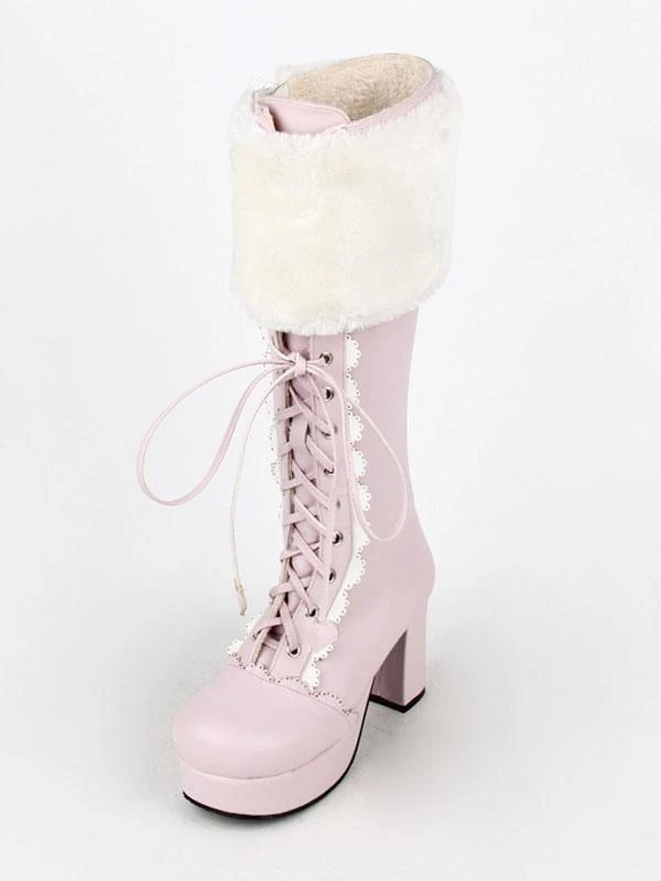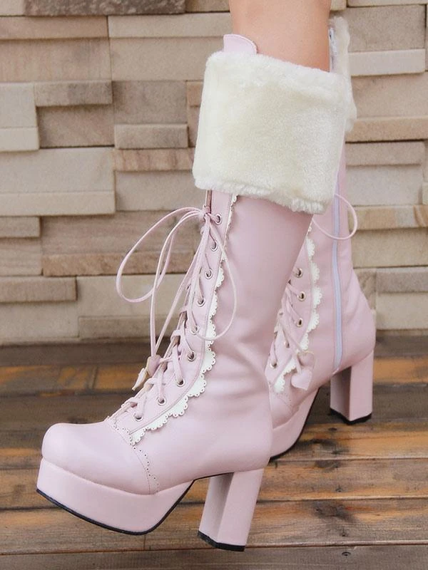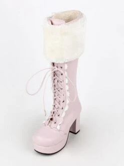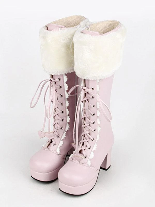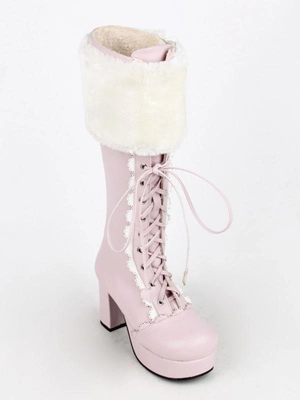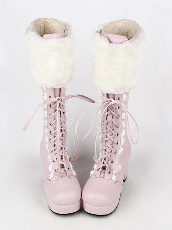 Lolitashow Sweet Lolita Boots Pink Faux Fur Lace Up Chunky Heel Boots