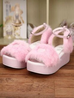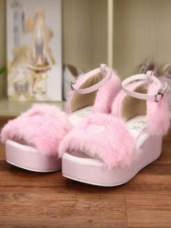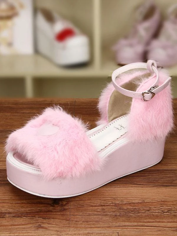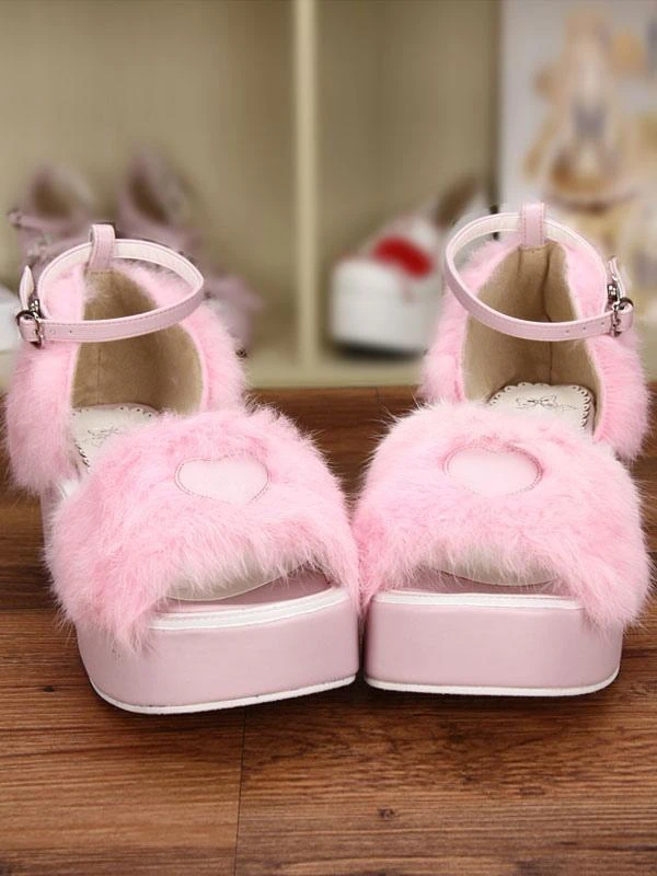 Lolitashow Sweet Pink Lolita Sandals Platform Fluffy Heart Shape Ankle Strap