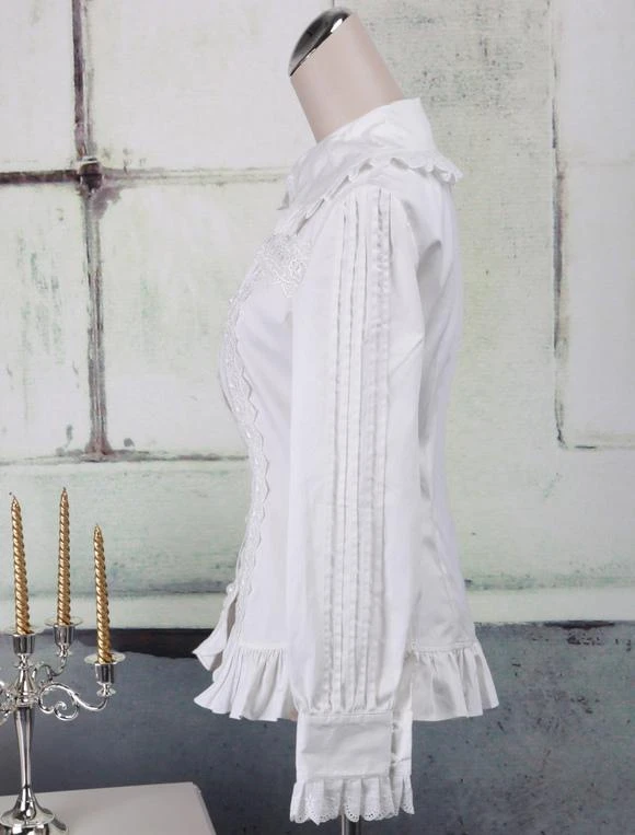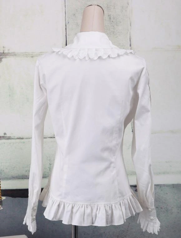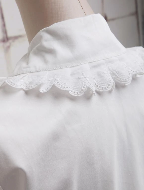 Lolitashow Sweet White Cotton Lolita Blouse Long Sleeves Ruffles Lace Trim Turn-down Collar
