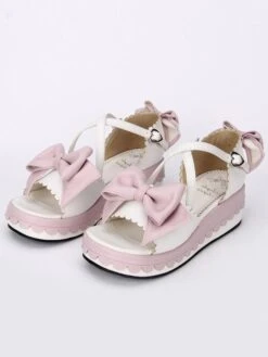 Lolitashow Sweet White Lolita Sandals Platform Pink Bows Ankle Straps Bows