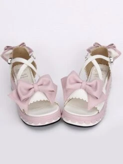 Lolitashow Sweet White Lolita Sandals Platform Pink Bows Ankle Straps Bows