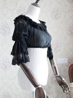 Lolitashow White Chiffon Lolita Blouse Middle Hime Sleeves Lace Trim High Waist