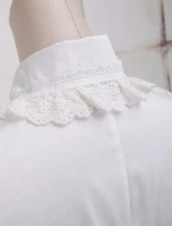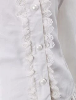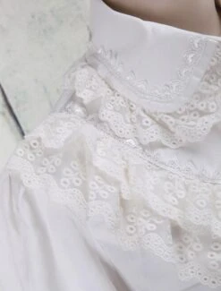 This beautiful blouse would make a great addition to any wardrobe. It’s versatile enough to be worn with a variety of styles – from Victorian to western. It features a turn down collar with lace trim and several tiers of lace trim across the bustline and down the front along the button placard. The pearl buttons add a wonderful feminine touch and the lace on the cuff sleeves matches the lace on the rest of the shirt for a polished look. A waist sash cinches the dress around the midsection, creating a nice tailored look.