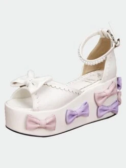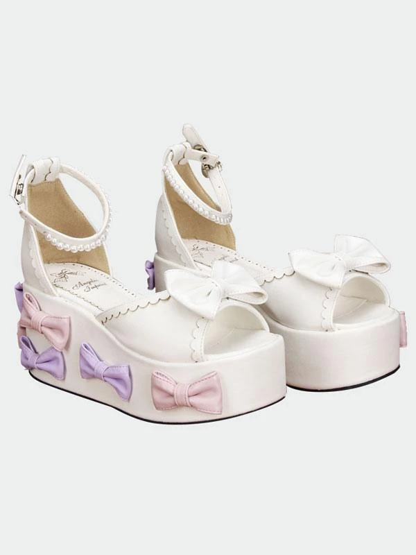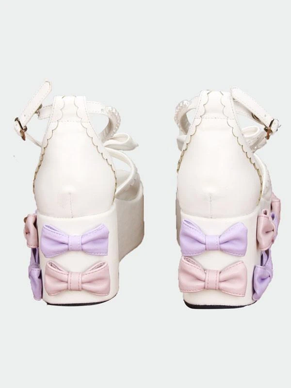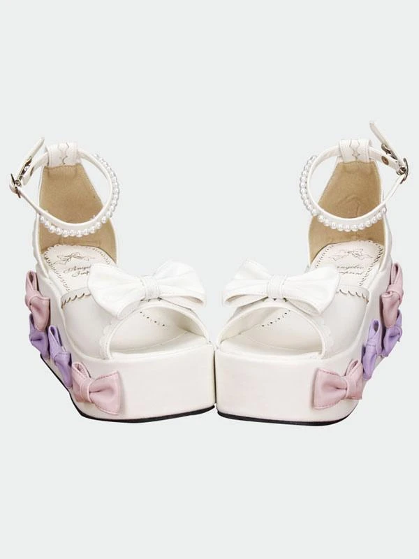 Lolitashow White Lolita Sandals High Platform Bows Pearls Decor Ankle Strap