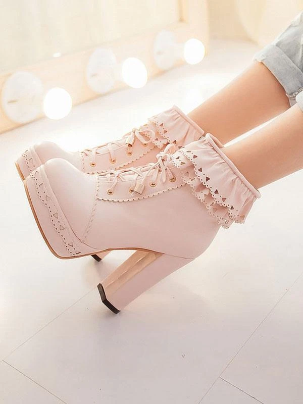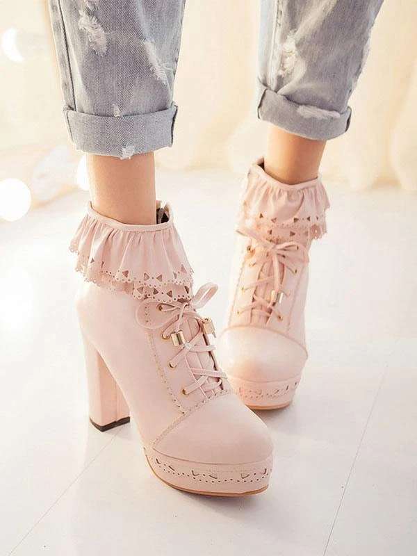 Pink Lolita Boots PU Leather Round Toe Chunky Heel Low Tops Lolita Footwear